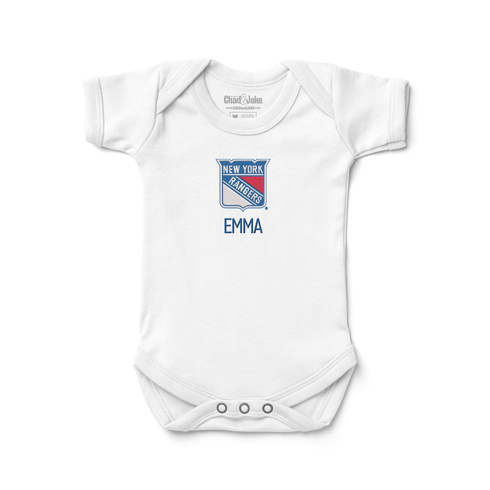 Each bodysuit is embroidered with the official New York Rangers logo on the front, and can be personalized with your child's name, initials, or nickname under the logo. This personalized bodysuit is the perfect way to show off your family's Rangers pride and let everyone know where you stand.