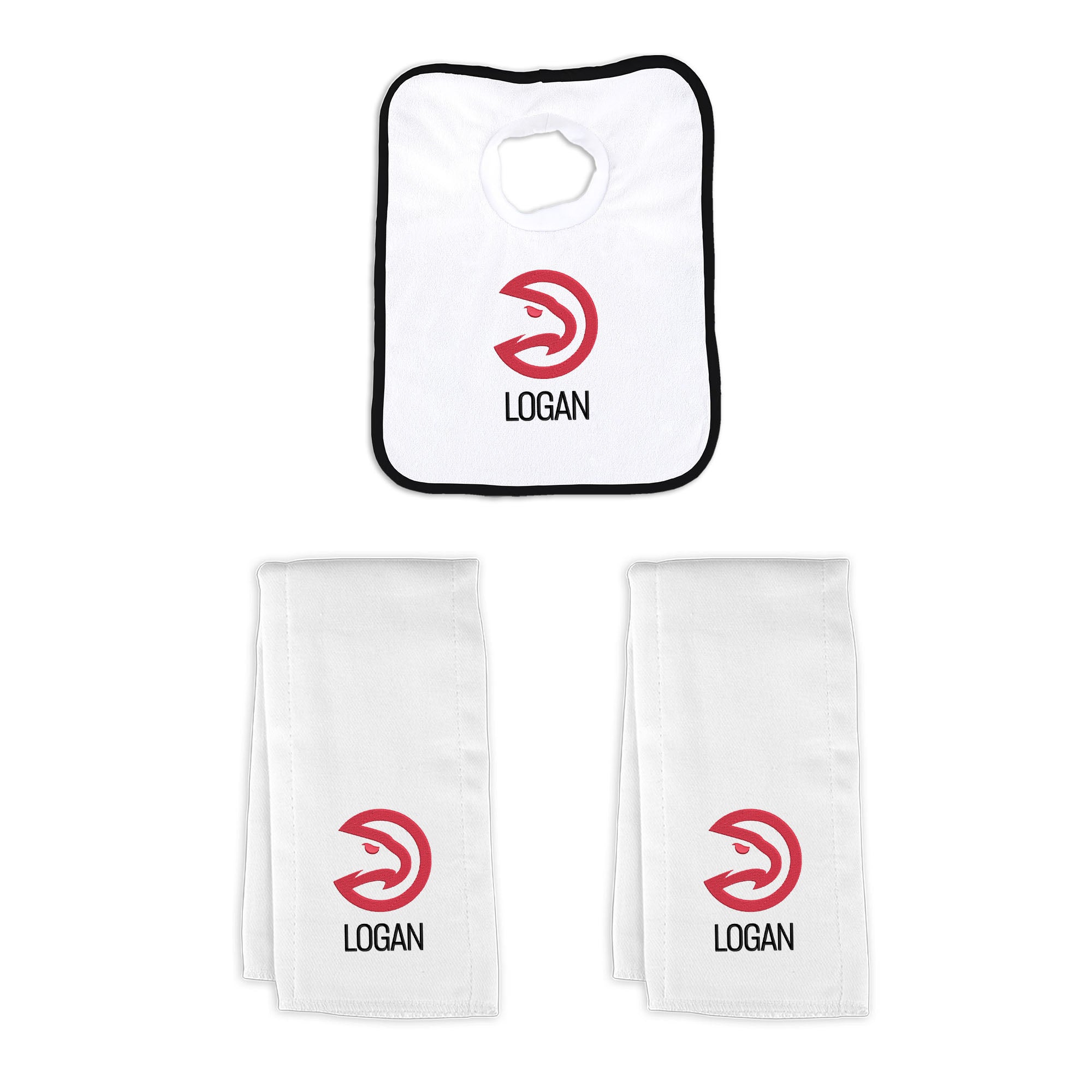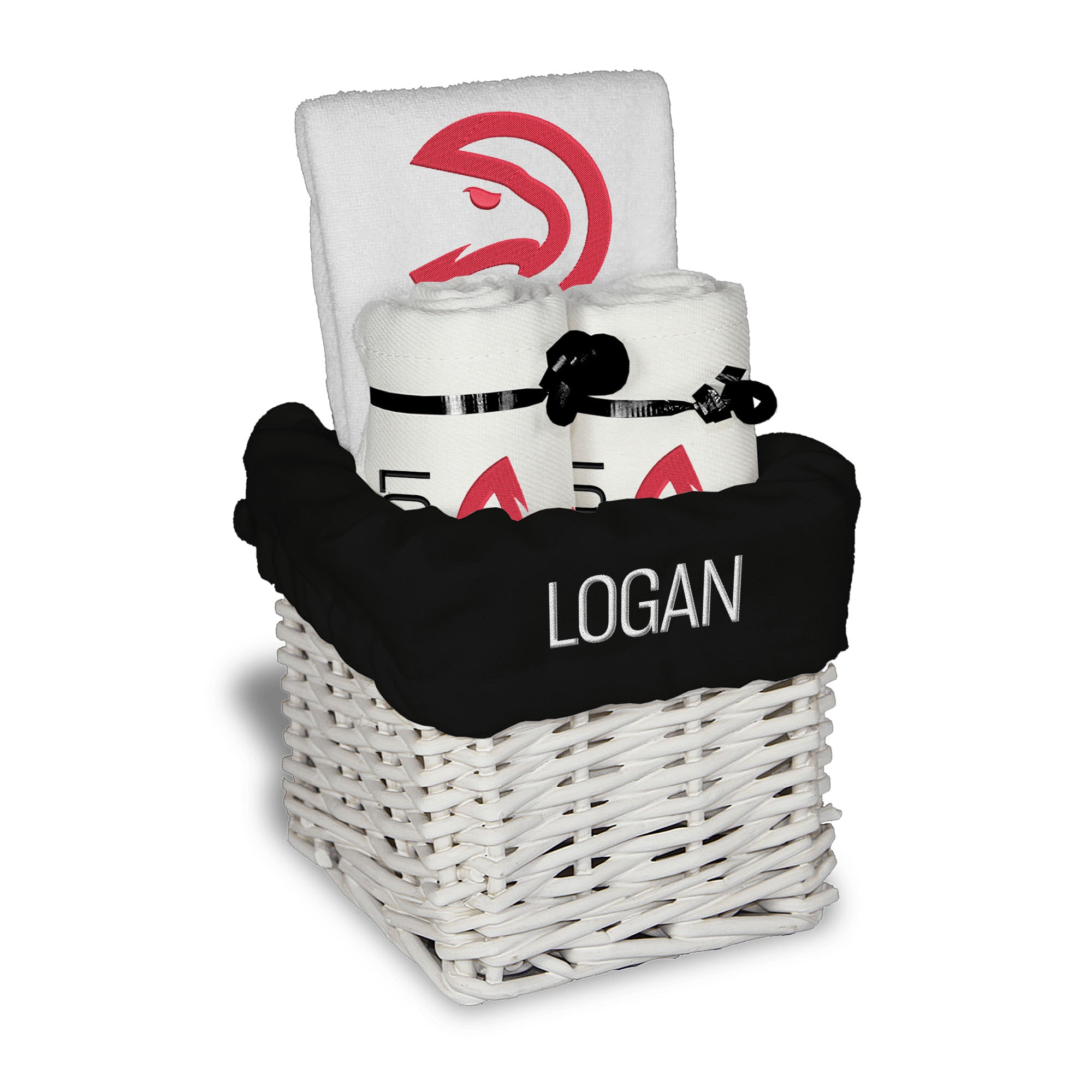 Our Personalized Atlanta Hawks Small Gift Basket contains 3 of our best-selling items packaged in a white willow basket with a personalized cotton liner. Each basket holds 2 of our 100% cotton burp cloths and a 100% cotton terry pullover bib. each piece is embroidered with the official Hawks logo and baby's name or nickname.