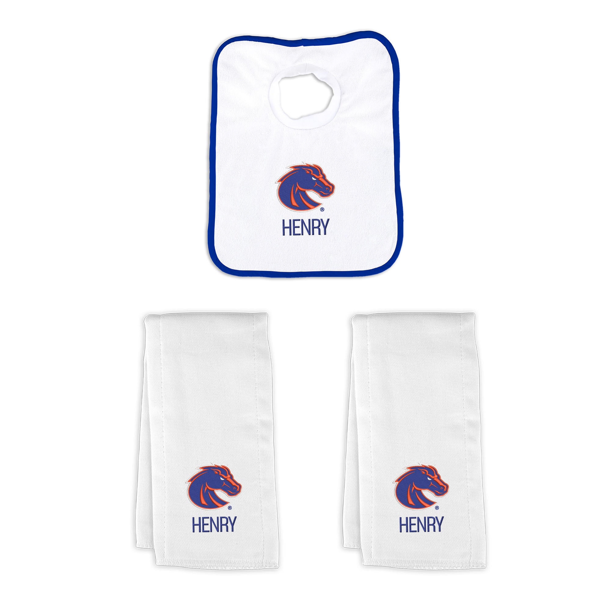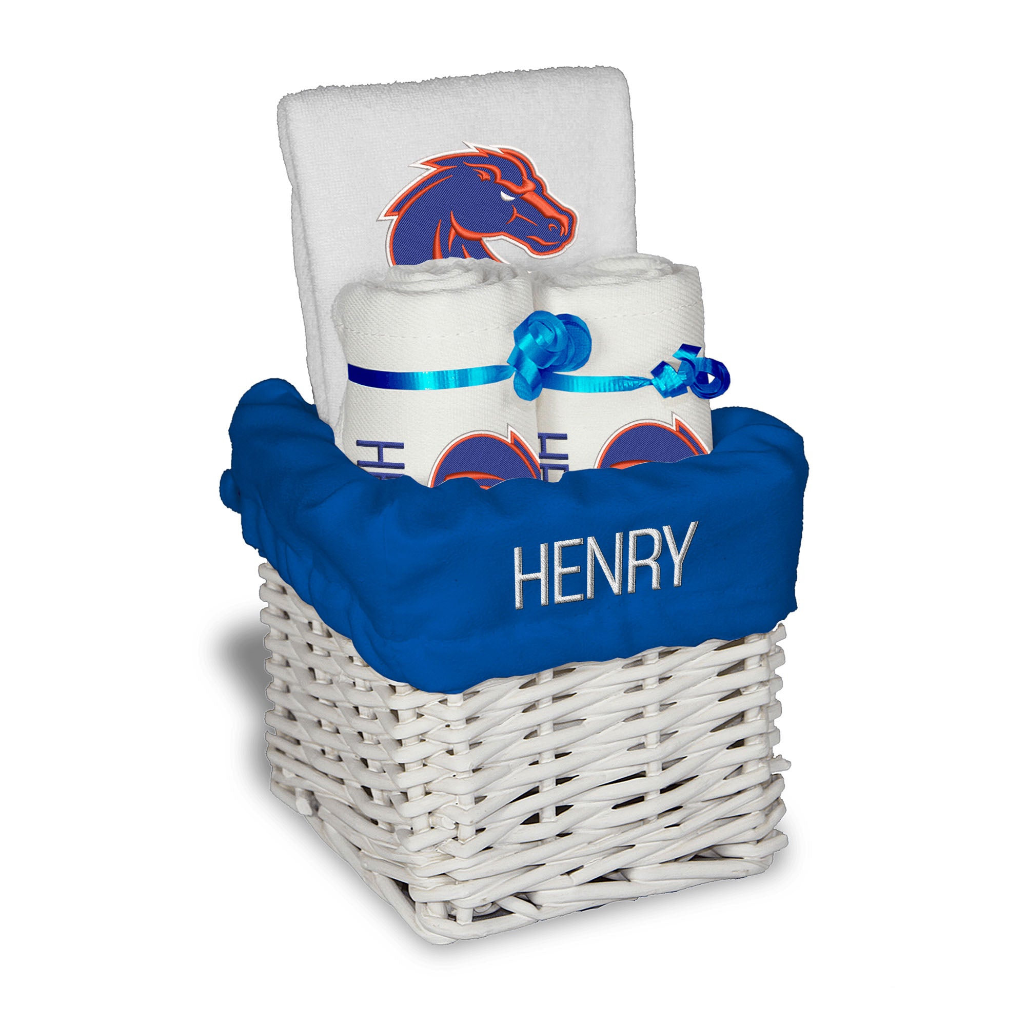 Our Personalized Boise State Broncos Small Gift Basket contains 3 of our best-selling items packaged in a white willow basket with a personalized cotton liner. Each basket holds 2 of our 100% cotton burp cloths and a 100% cotton terry pullover bib. each piece is embroidered with the official Broncos logo and baby's name or nickname.