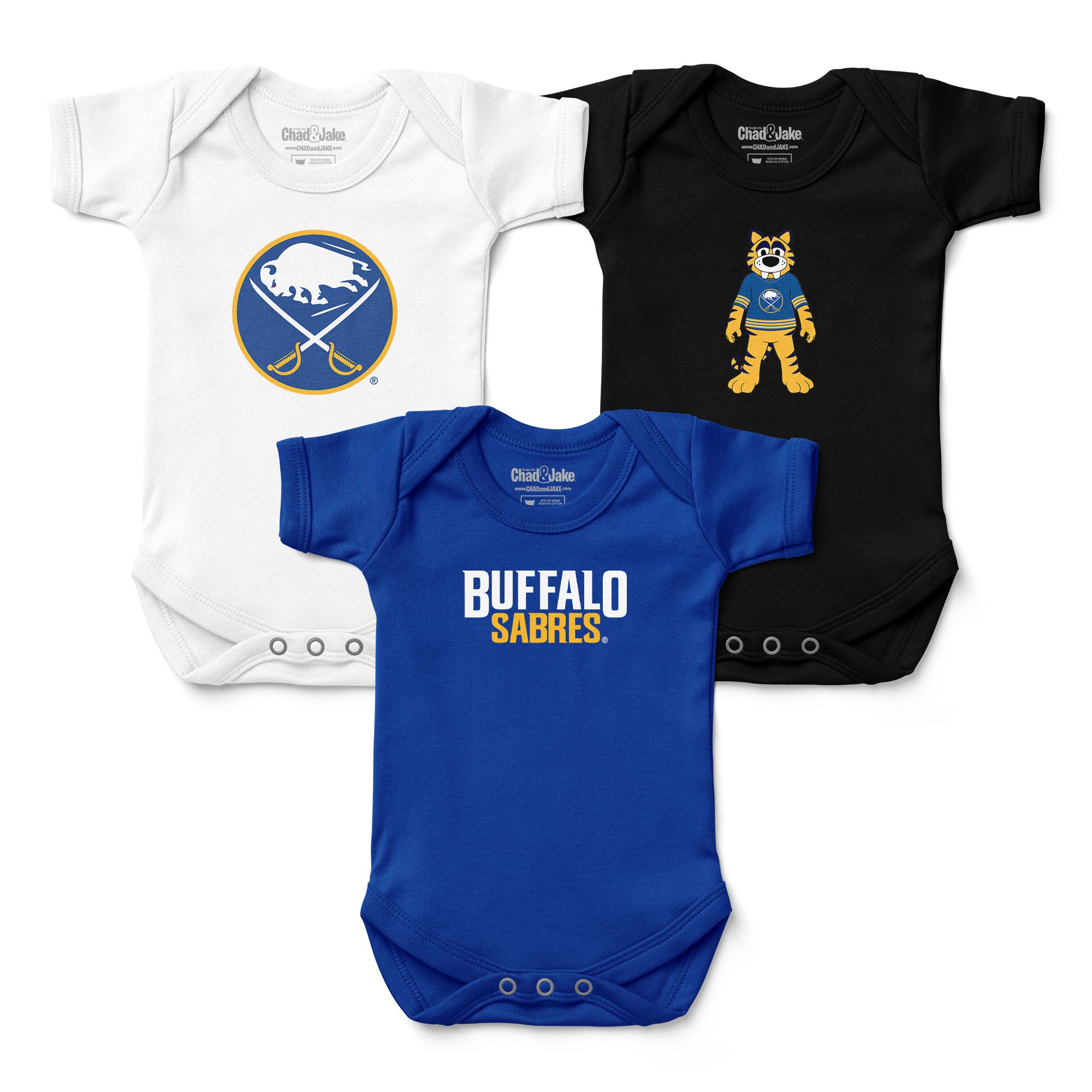 Introduce your little one to the world of hockey with our officially licensed Buffalo Sabres 3-Pack Bodysuits. Crafted from soft and breathable cotton, these bodysuits are perfect for keeping your baby comfortable throughout the day. Each pack includes three unique designs that proudly represent the Buffalo Sabres, ensuring your baby looks adorable while supporting the team. Available in five sizes: 0-3 Months, 3-6 Months, 6-12 Months, 12-18 Months, and 18-24 Months. Whether it's game day or everyday wear, your little one will be the cutest Sabres fan in town. Get your 3-pack today and show your Buffalo Sabres spirit!