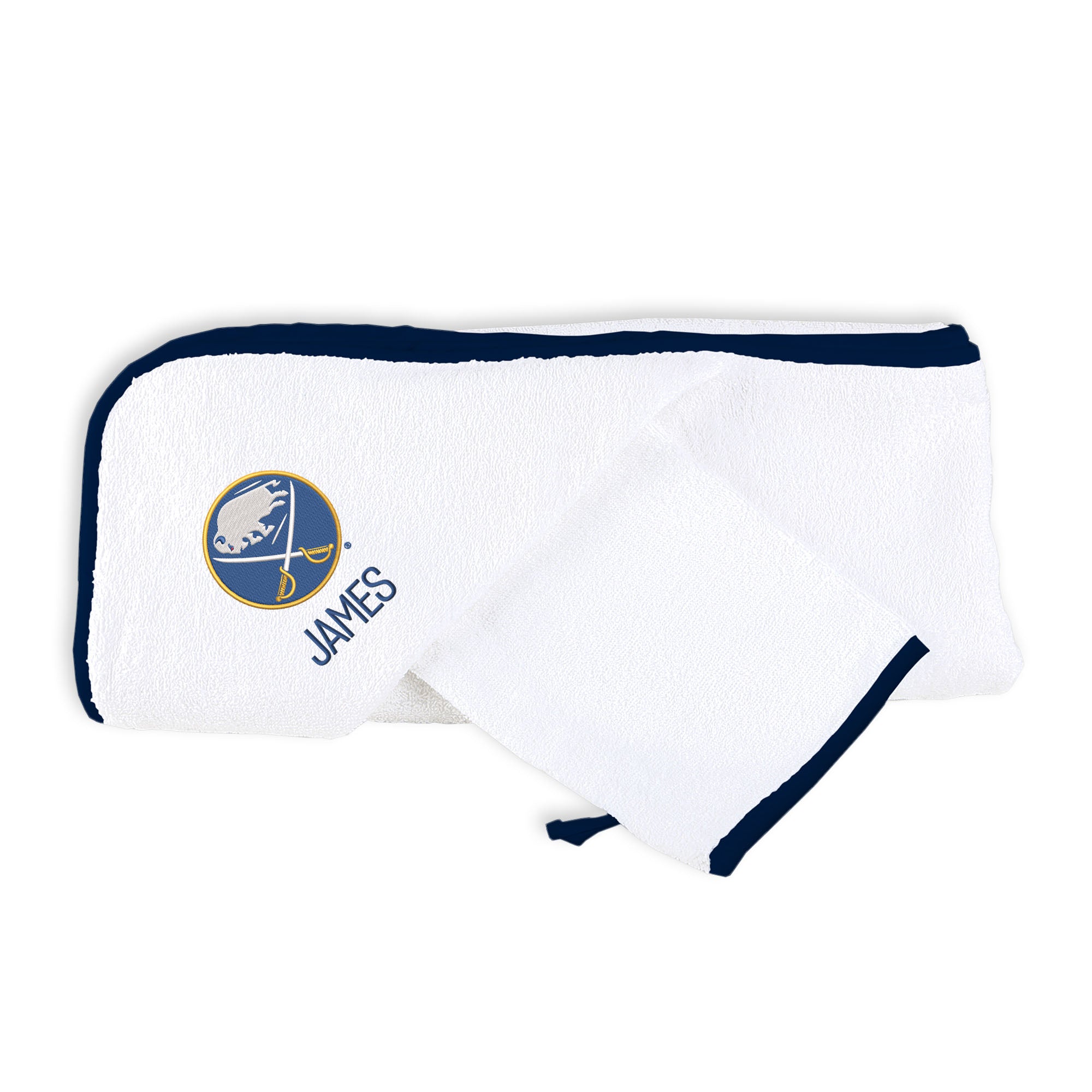 Pamper your youngest sports fan with our Officially Licensed Personalized Buffalo Sabres Hooded Towel and Wash Mitt Set. Crafted from soft 100% cotton terry, the wash mitt fits over your hand for gentle sudsing and cleansing; then, wrap the baby up in the absorbent Sabres logoed hooded towel. The hooded corner of the towel keeps baby’s head warm while the generously sized towel wraps your future Sabres in cozy comfort. Each towel is embroidered with the official Buffalo Sabres logo and baby’s name or nickname.