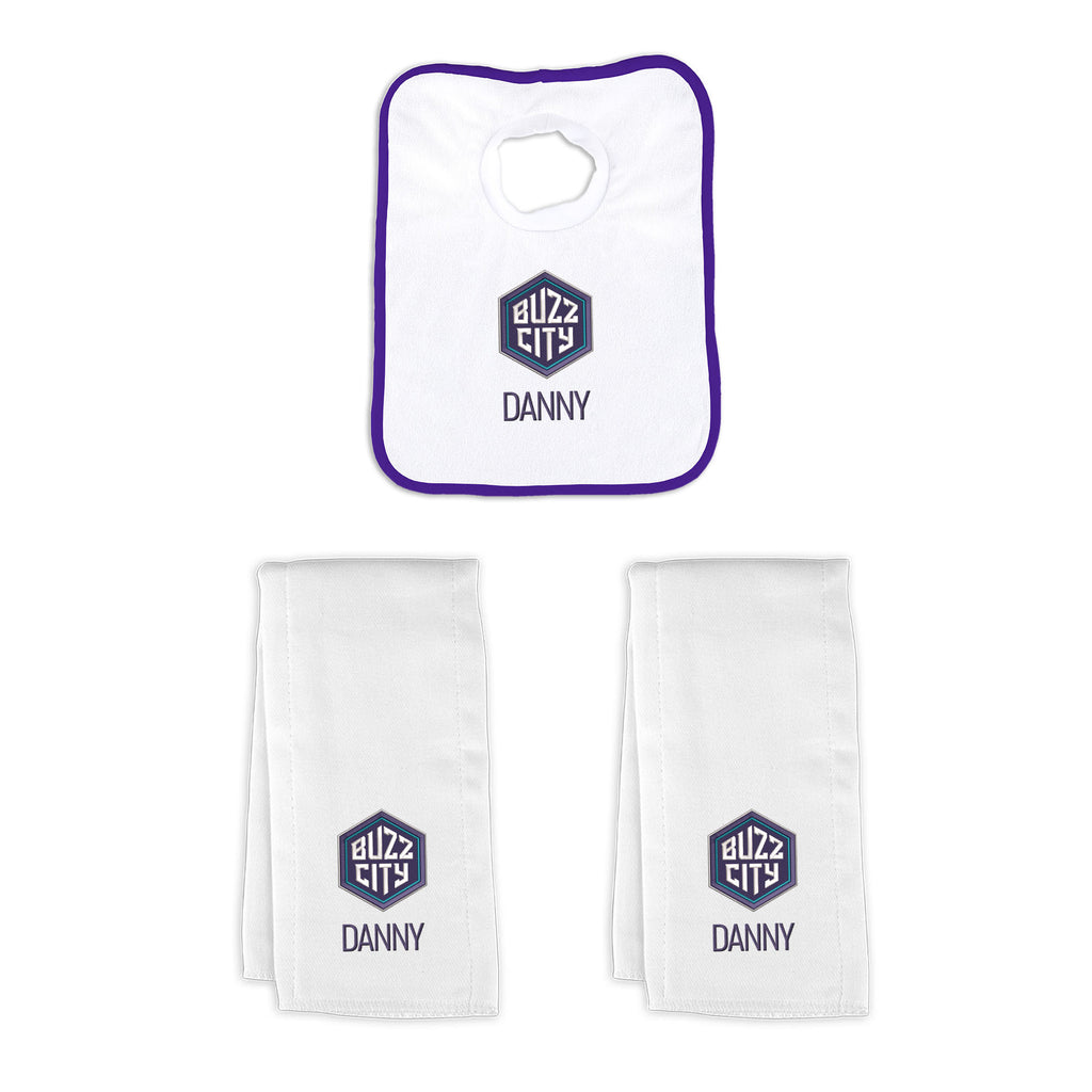 Our Personalized Charlotte Hornets Small Gift Basket contains 3 of our best-selling items packaged in a white willow basket with a personalized cotton liner.  Each basket holds 2 of our 100% cotton burp cloths and a 100% cotton terry pullover bib. each piece is embroidered with the official Hornets logo and baby's name or nickname.
