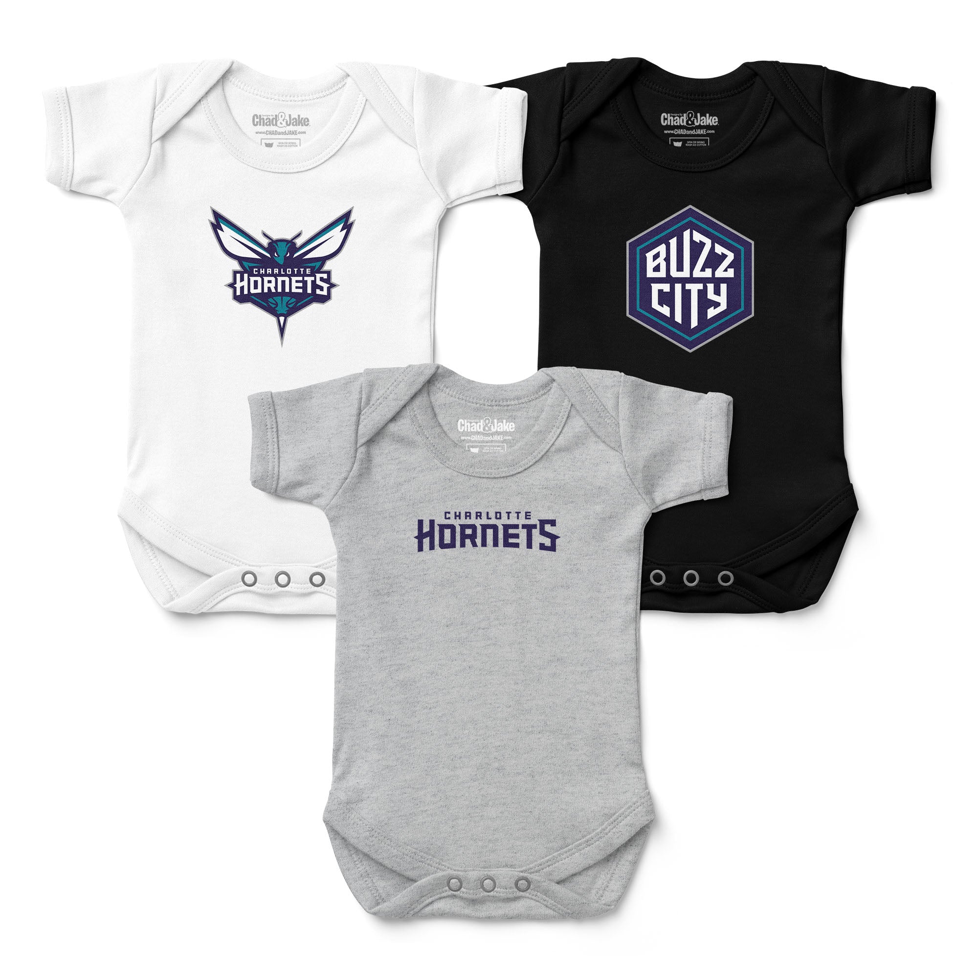Introduce your little one to the world of hockey with our officially licensed Charlotte Hornets 3-Pack Bodysuits. Crafted from soft and breathable cotton, these bodysuits are perfect for keeping your baby comfortable throughout the day. Each pack includes three unique designs that proudly represent the Charlotte Hornets, ensuring your baby looks adorable while supporting the team. Available in five sizes: 0-3 Months, 3-6 Months, 6-12 Months, 12-18 Months, and 18-24 Months. Whether it's game day or everyday wear, your little one will be the cutest Hornets fan in town. Get your 3-pack today and show your Charlotte Hornets spirit!