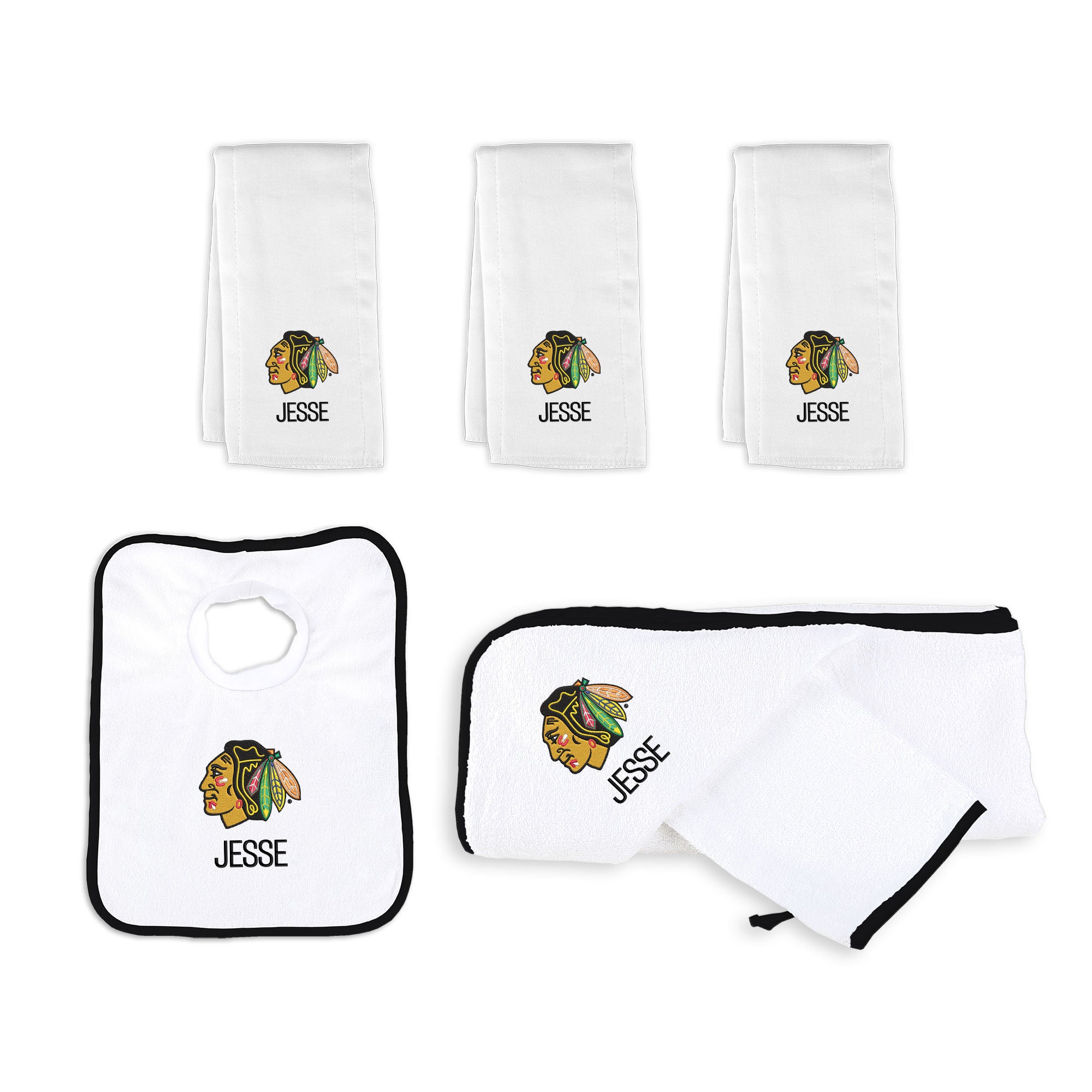 This personalized gift basket contains a trio of 100% cotton burp cloths, a 100% cotton terry pullover bib, and a 100% cotton terry hooded towel with a wash mitt. Each of these high-quality items is expertly embroidered with the iconic Chicago Blackhawks logo, making them the ideal choice for young Blackhawks fans in the making.