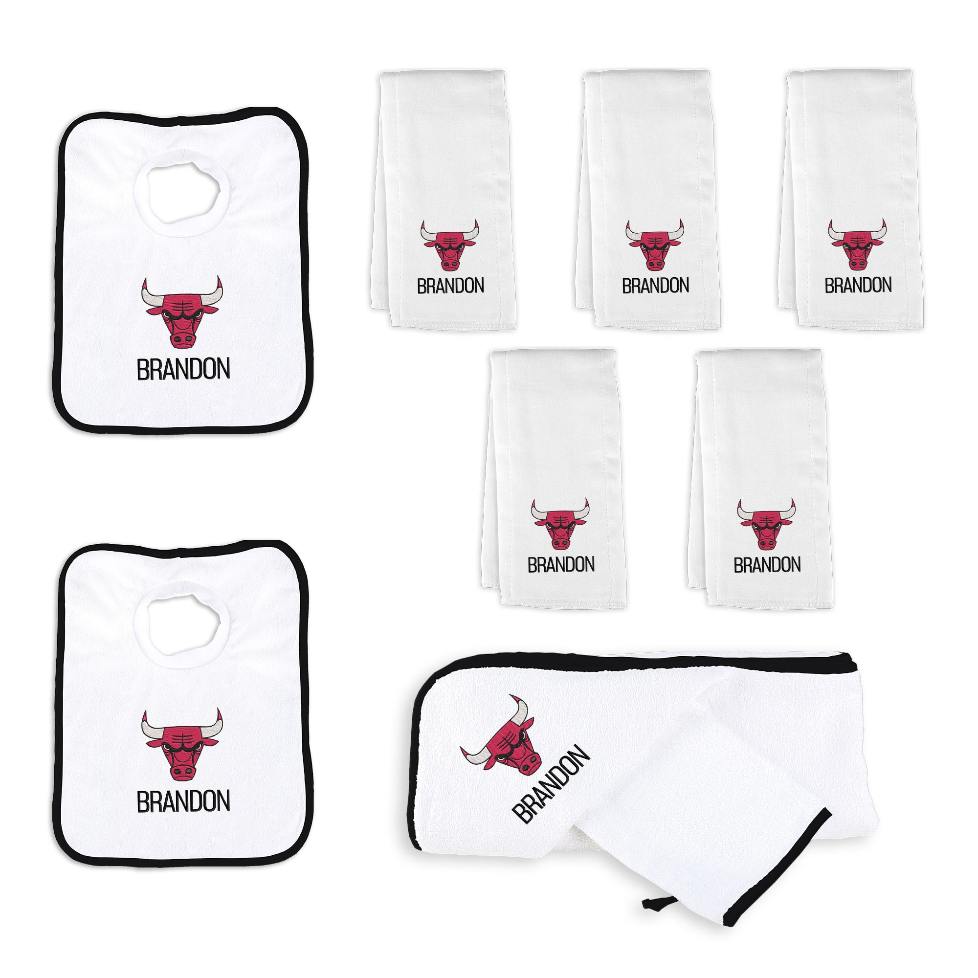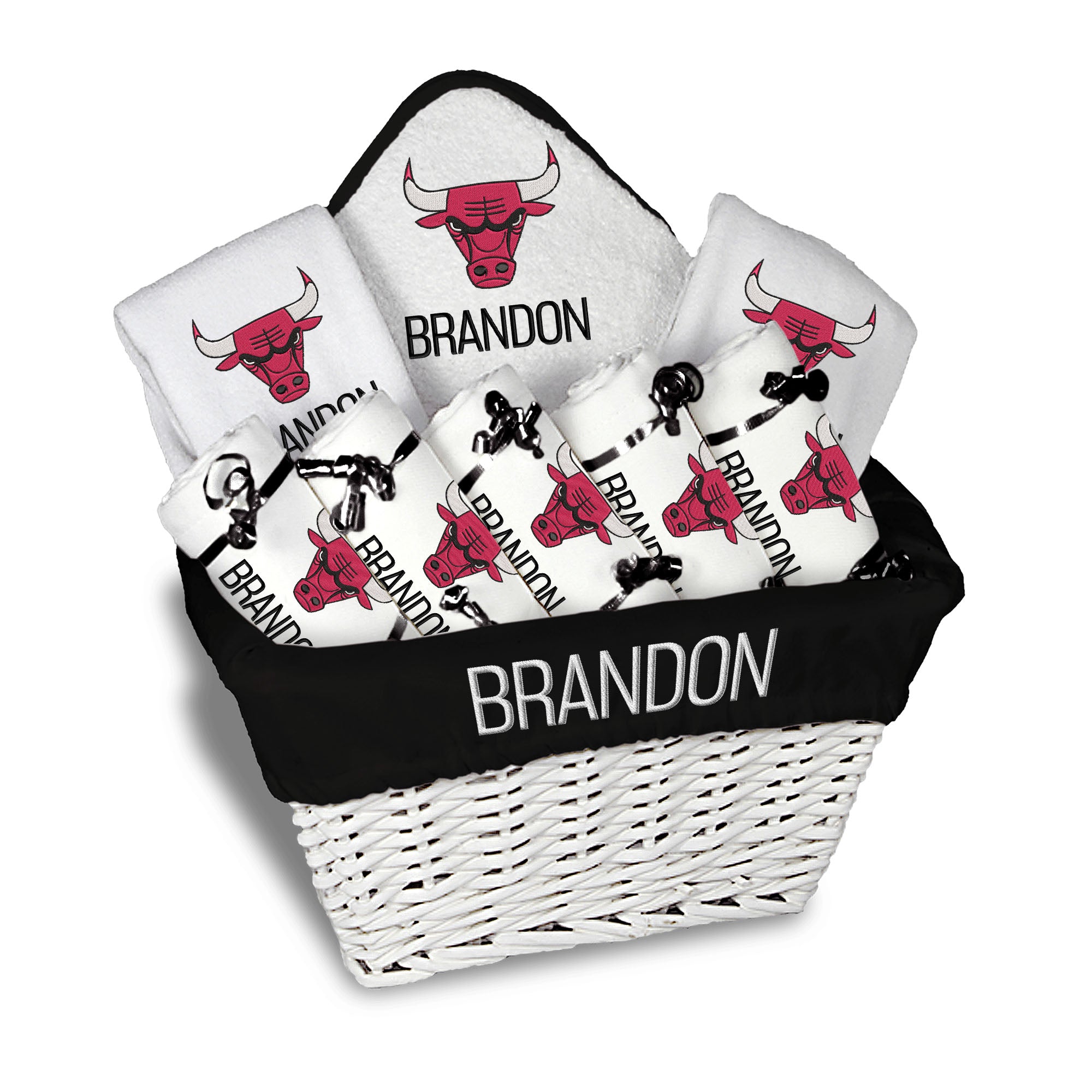 Our Personalized Chicago Bulls Large Gift Basket contains an assortment of our best-selling items packaged in a white willow basket with a personalized cotton liner. Each basket holds five of our 100% cotton burp cloths, two 100% cotton terry pullover bibs, and one 100% cotton terry hooded towel and wash mitt. The burp cloths, bibs and hooded towel are each embroidered with the Bulls logo and baby’s name or nickname; the basket liner is embroidered with the baby’s name.
