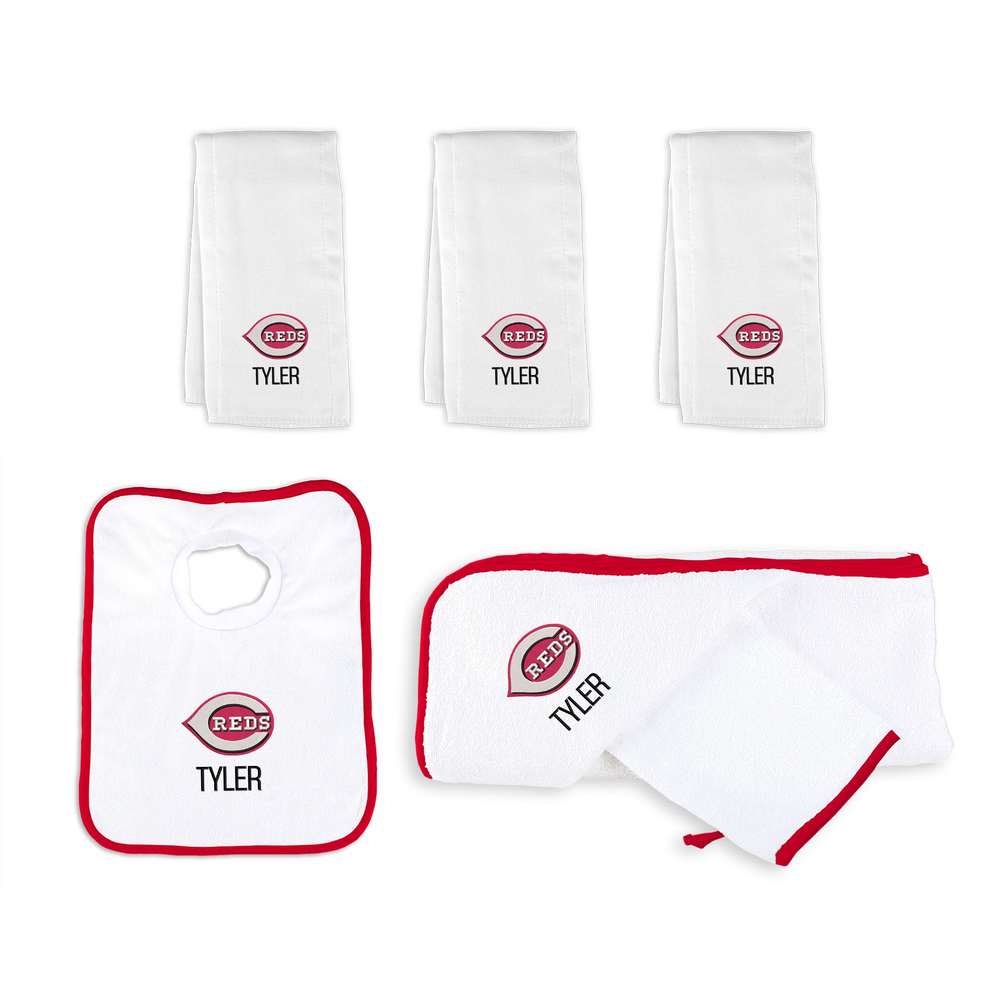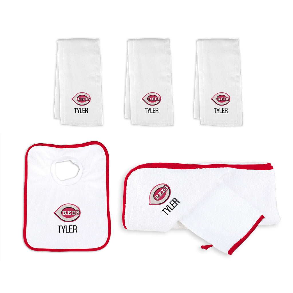 - 1 100% cotton terry hooded towel and wash mitt set, both adorned with the Cincinnati Reds logo and your baby's name.