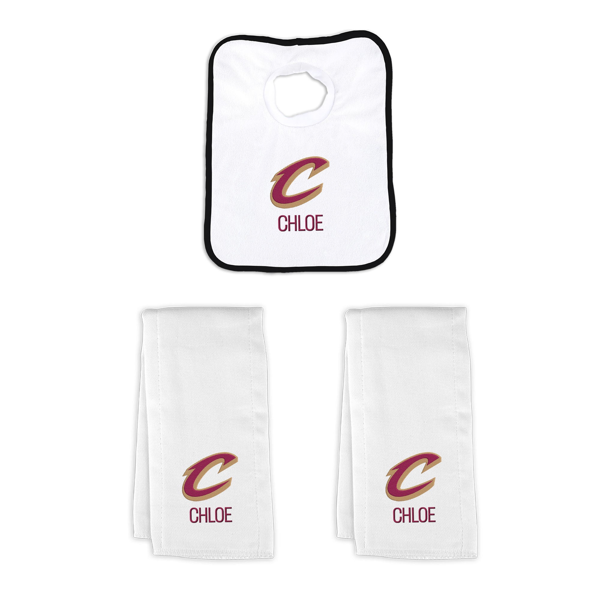 Our Personalized Cleveland Cavaliers Small Gift Basket contains 3 of our best-selling items packaged in a white willow basket with a personalized cotton liner. Each basket holds 2 of our 100% cotton burp cloths and a 100% cotton terry pullover bib. each piece is embroidered with the official Cavaliers logo and baby's name or nickname.