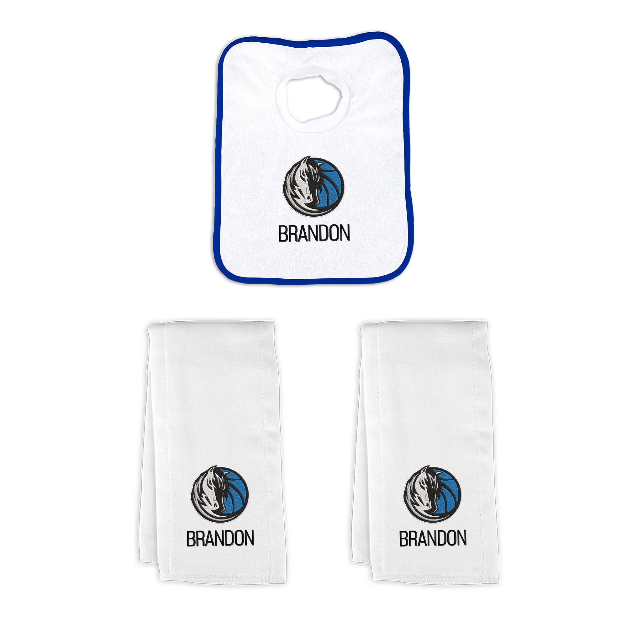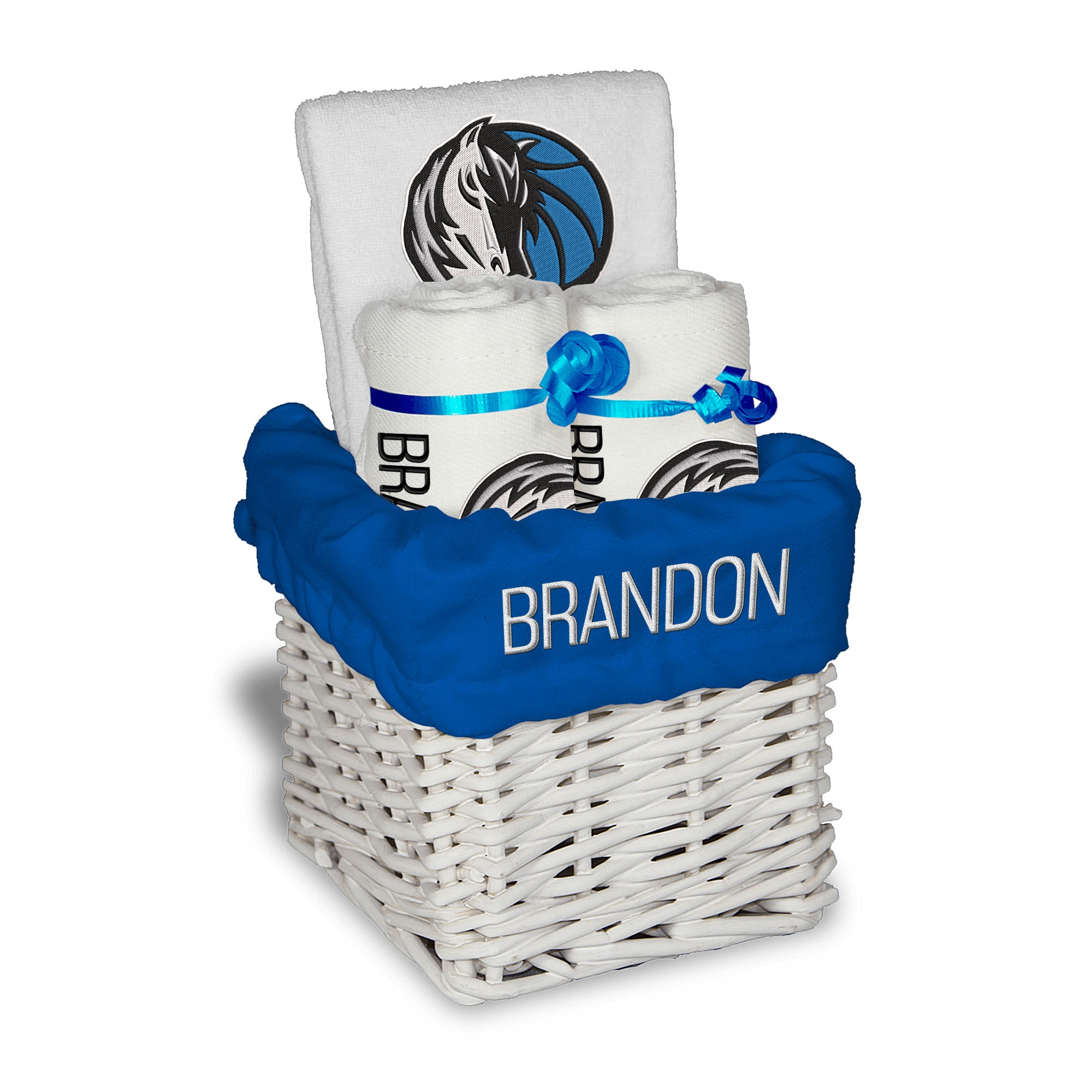 Our Personalized Dallas Mavericks Small Gift Basket contains 3 of our best-selling items packaged in a white willow basket with a personalized cotton liner.  Each basket holds 2 of our 100% cotton burp cloths and a 100% cotton terry pullover bib. each piece is embroidered with the official Mavericks logo and baby's name or nickname.