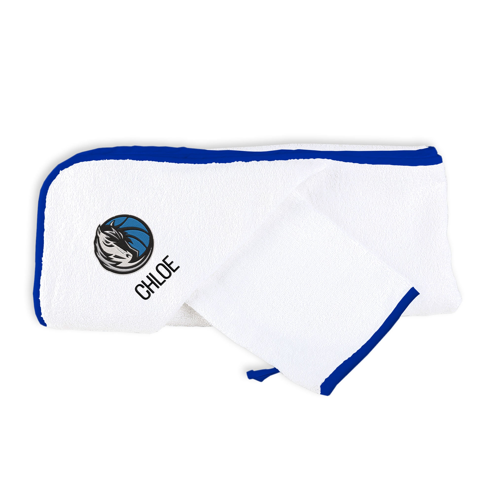 Pamper your youngest sports fan with our Officially Licensed Personalized Dallas Mavericks Hooded Towel and Wash Mitt Set. Crafted from soft 100% cotton terry, the wash mitt fits over your hand for gentle sudsing and cleansing; then, wrap the baby up in the absorbent Mavericks logoed hooded towel. The hooded corner of the towel keeps baby’s head warm while the generously sized towel wraps your future Hawk in cozy comfort. Each towel is embroidered with the official Dallas Mavericks logo and baby’s name or nickname.