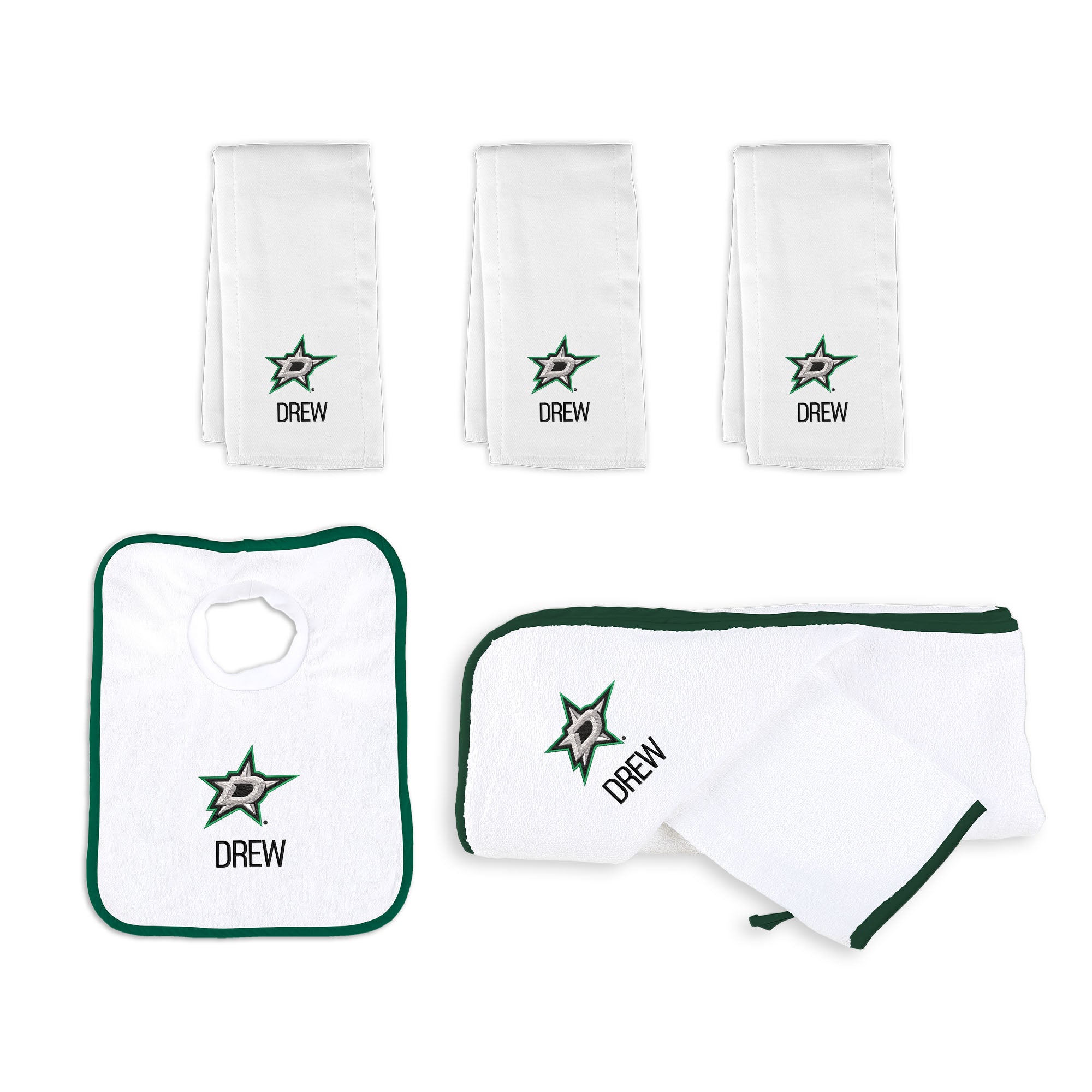 This personalized gift basket contains a trio of 100% cotton burp cloths, a 100% cotton terry pullover bib, and a 100% cotton terry hooded towel with a wash mitt. Each of these high-quality items is expertly embroidered with the iconic Dallas Stars logo, making them the ideal choice for young Stars fans in the making.