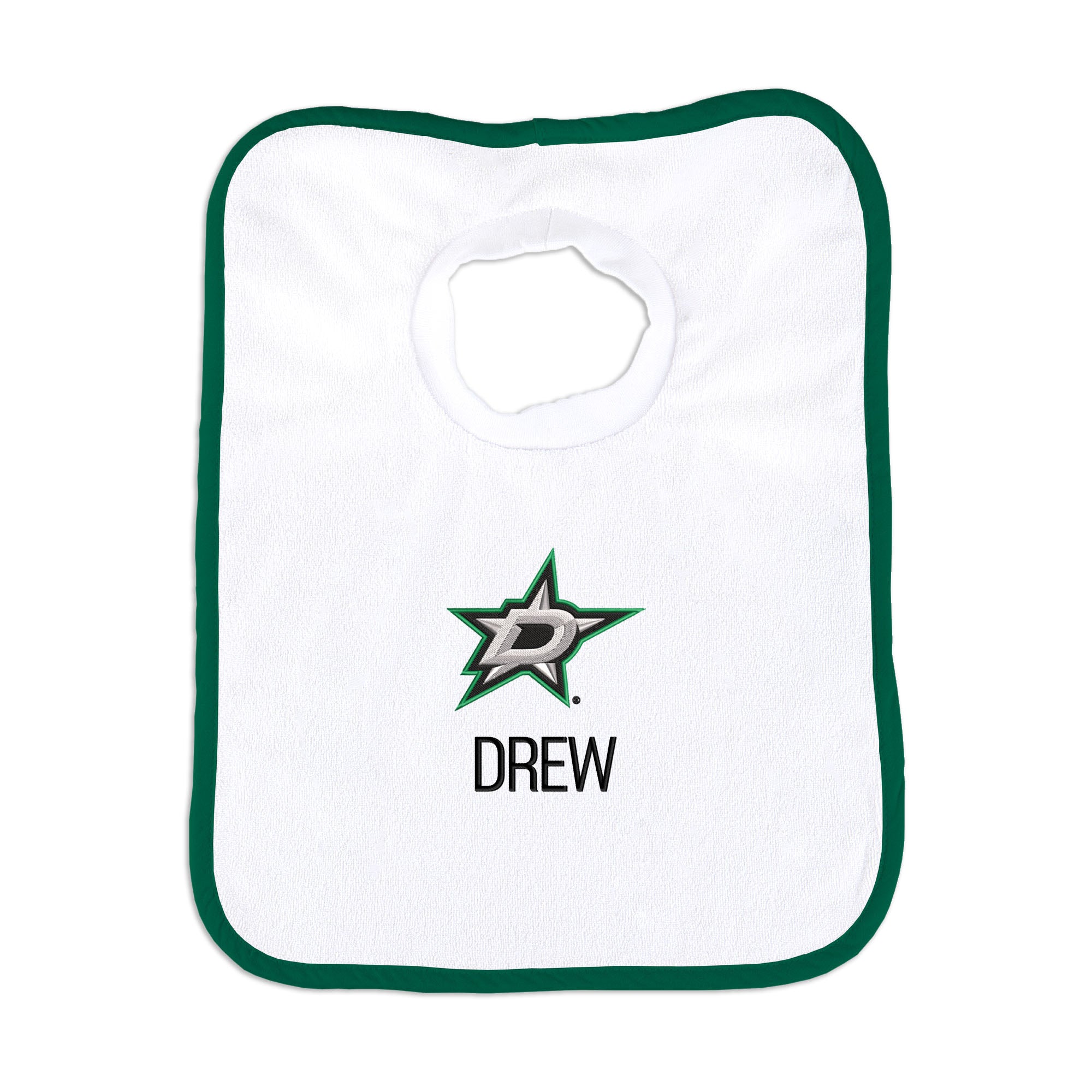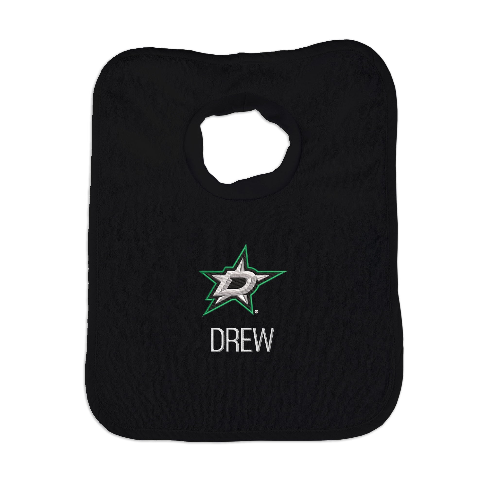 Our Personalized Dallas Stars Bib is the perfect accessory for every baby Stars fan. The Stars bib slips on easily over baby’s head, with a neck hole that is specially designed for extra comfort with super soft, gently gathered stretch cotton. Each bib is embroidered with the Stars logo and your little one’s name or nickname. Makes a wonderful gift for new babies and their families.