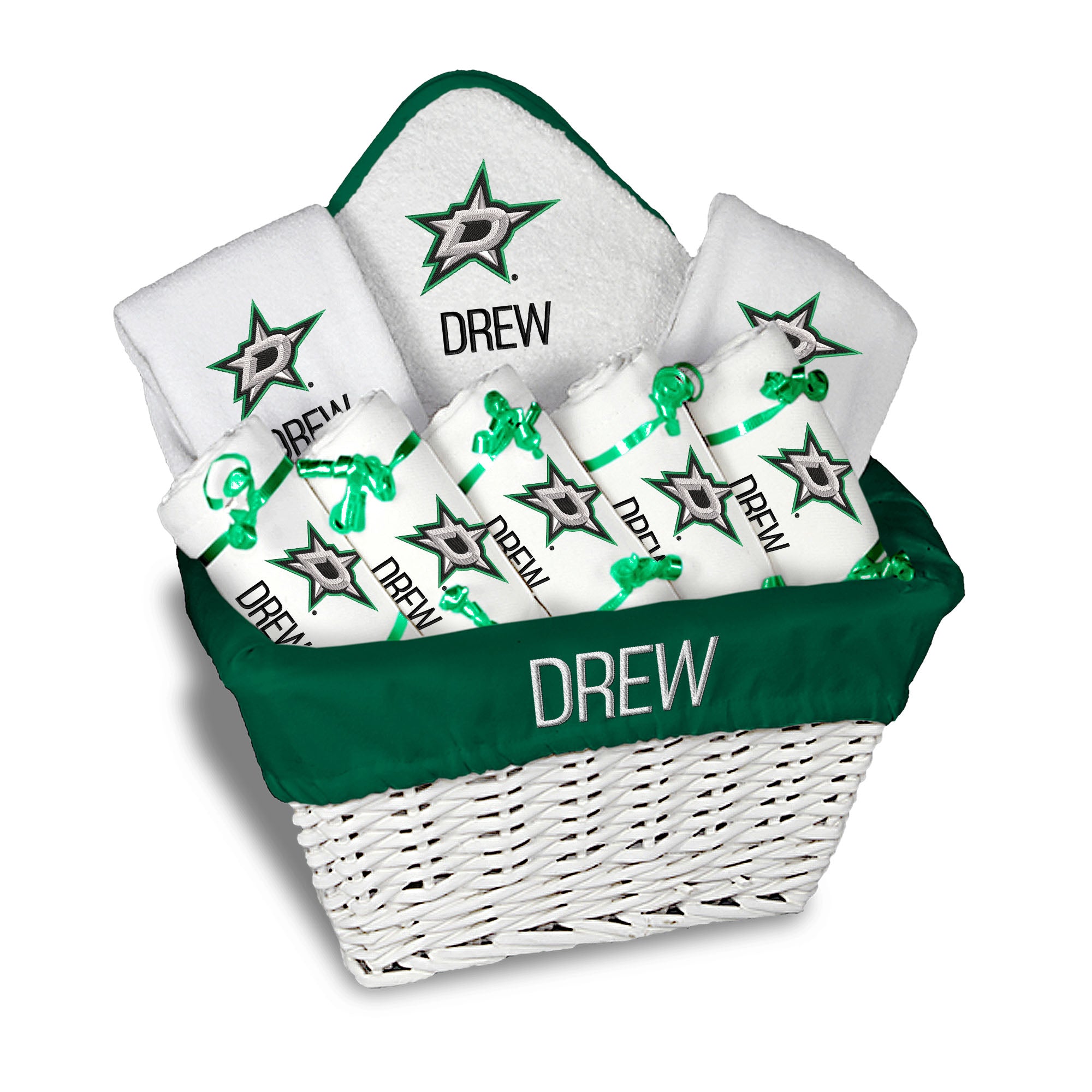 Our Personalized Dallas Stars Large Gift Basket contains an assortment of our best-selling items packaged in a white willow basket with a personalized cotton liner. Each basket holds five of our 100% cotton burp cloths, two 100% cotton terry pullover bibs, and one 100% cotton terry hooded towel and wash mitt. The burp cloths, bibs and hooded towel are each embroidered with the Stars logo and baby’s name or nickname; the basket liner is embroidered with the baby’s name.
