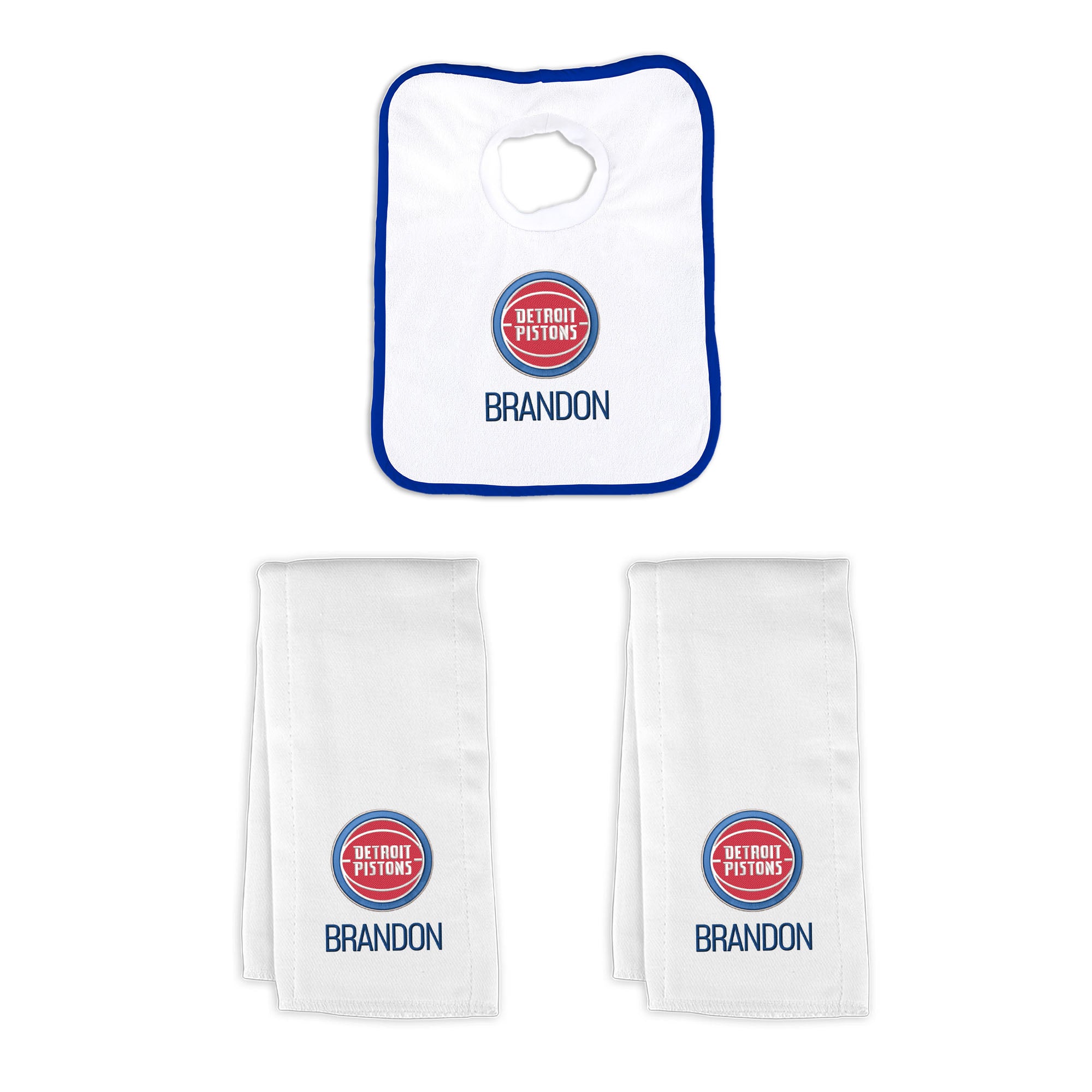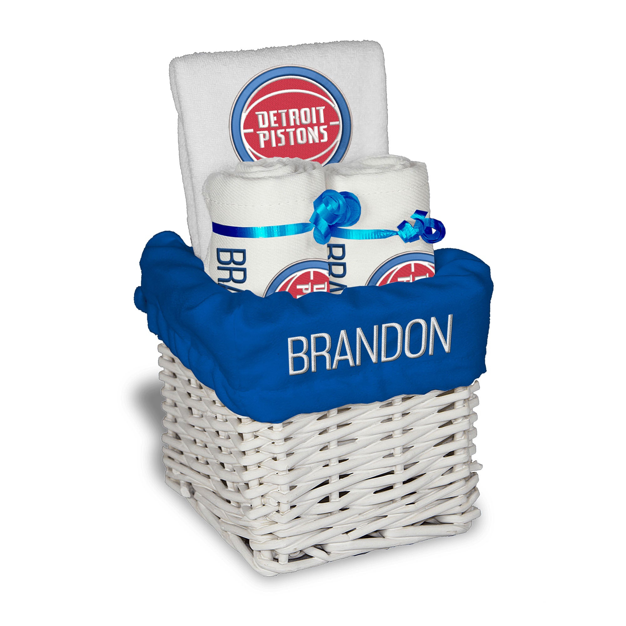 Our Personalized Detroit Pistons Small Gift Basket contains 3 of our best-selling items packaged in a white willow basket with a personalized cotton liner. Each basket holds 2 of our 100% cotton burp cloths and a 100% cotton terry pullover bib. each piece is embroidered with the official Pistons logo and baby's name or nickname.