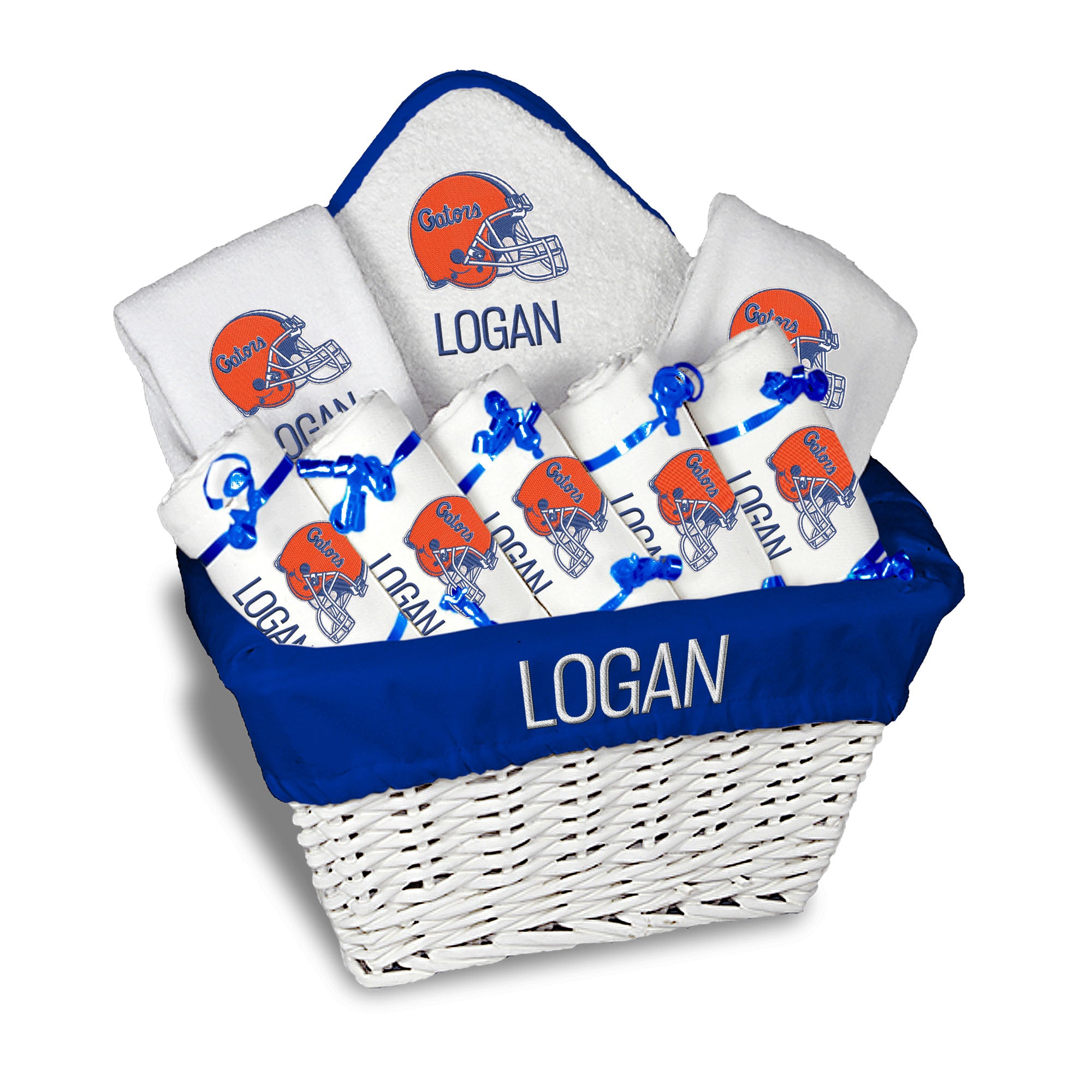 Our Personalized Florida Gators Large Gift Basket contains an assortment of our best-selling items packaged in a white willow basket with a personalized cotton liner.  Each basket holds five of our 100% cotton burp cloths, two 100% cotton terry pullover bibs, and one 100% cotton terry hooded towel and wash mitt. The burp cloths, bibs and hooded towel are each embroidered with the Gators logo and baby’s name or nickname; the basket liner is embroidered with the baby’s name.