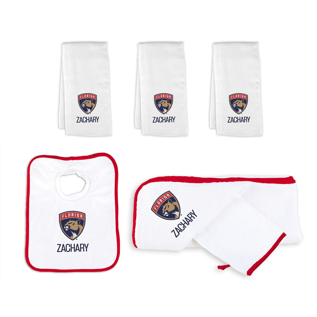 This personalized gift basket contains a trio of 100% cotton burp cloths, a 100% cotton terry pullover bib, and a 100% cotton terry hooded towel with a wash mitt. Each of these high-quality items is expertly embroidered with the iconic Florida Panthers logo, making them the ideal choice for young Panthers fans in the making.