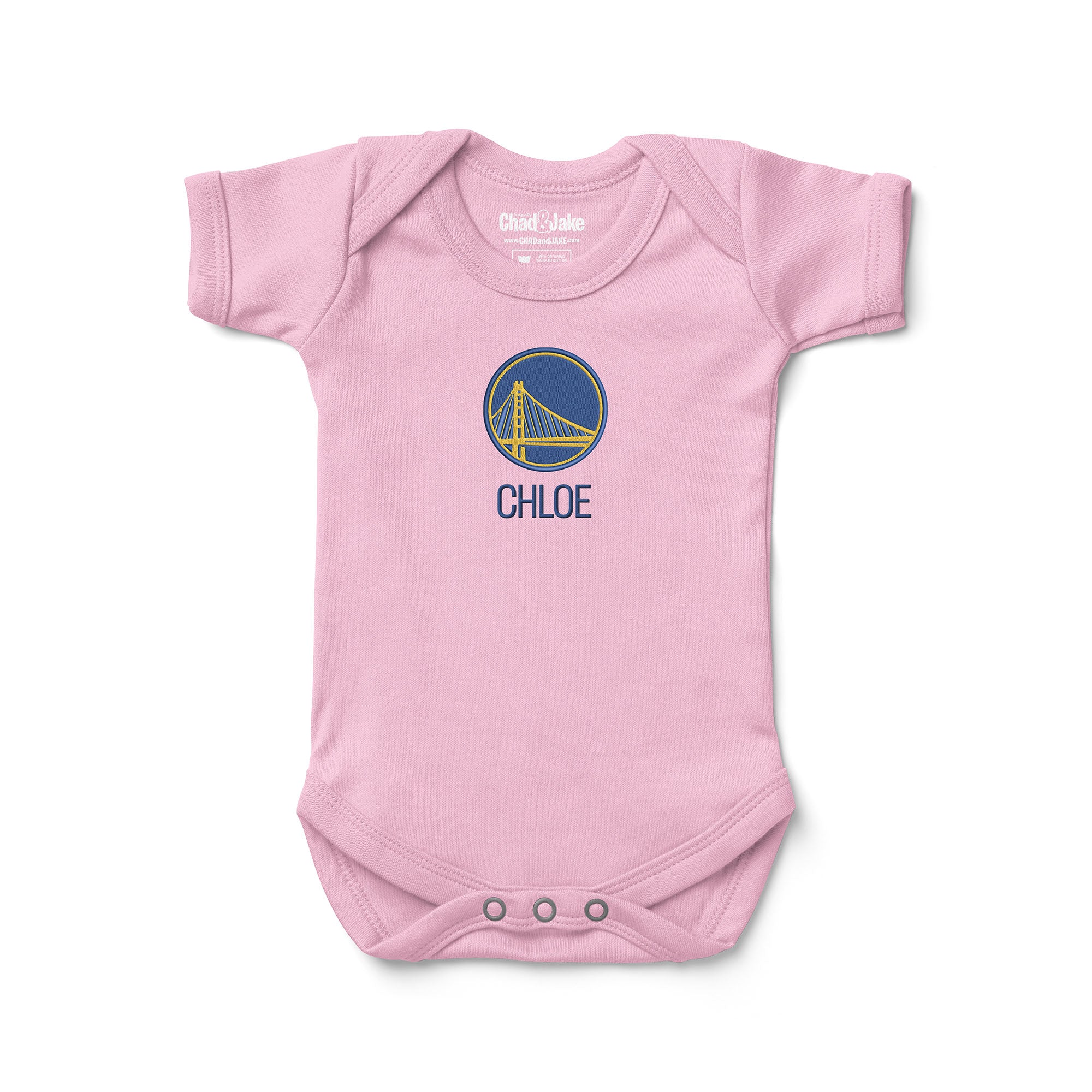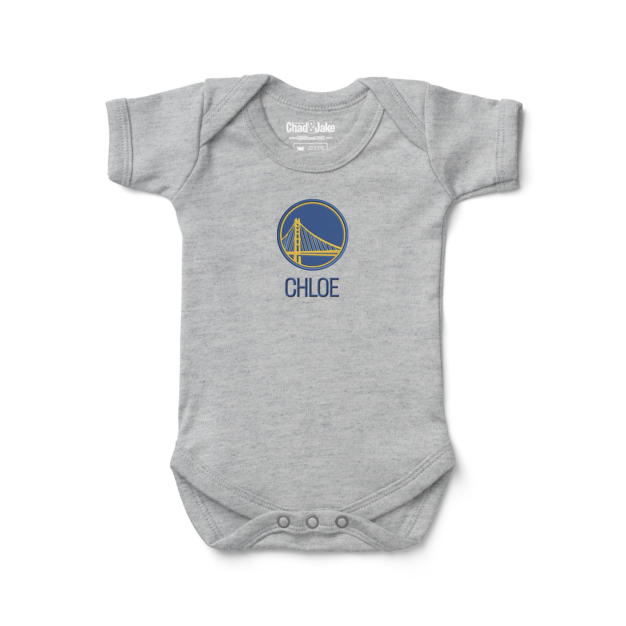 Represent your favorite NBA team with this Golden State Warriors bodysuit for baby and kids. Made from 100% super-soft interlock cotton, this bodysuit features an envelope neck for extra comfort and a three-snap closure for easy dressing and undressing. It is machine washable and tumble dryable, making it perfect for active little ones who love to show their team spirit. This bodysuit is embroidered with the Golden State Warriors logo on the front and personalized with your little one's name, initials, or nickname under the logo. Let everyone know who your little one roots for at Oracle Arena or on the road with the team's slogan, "Dub Nation." From their record six NBA championships to current and retired players like Stephen Curry, Klay Thompson, and Kevin Durant, your little one will be decked out in Golden State Warriors pride. Whether they're playing around at home or at the playground, this personalized bodysuit will let everyone know where their loyalty lies.