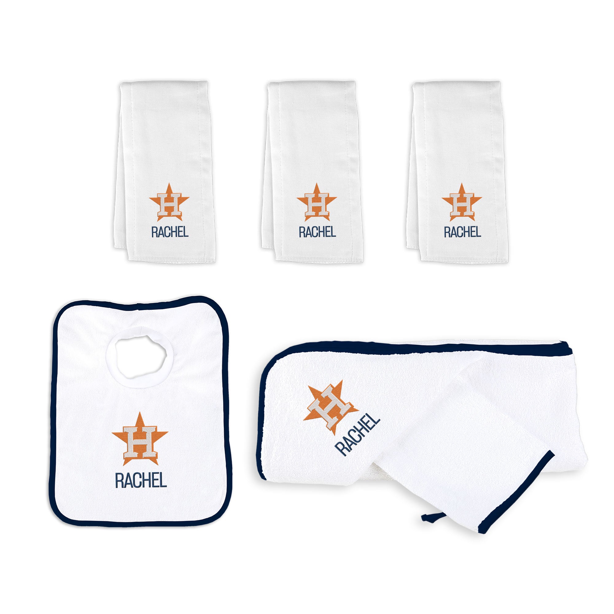 • 1 100% cotton terry hooded towel and wash mitt set, both adorned with the Houston Astros logo and your baby's name.