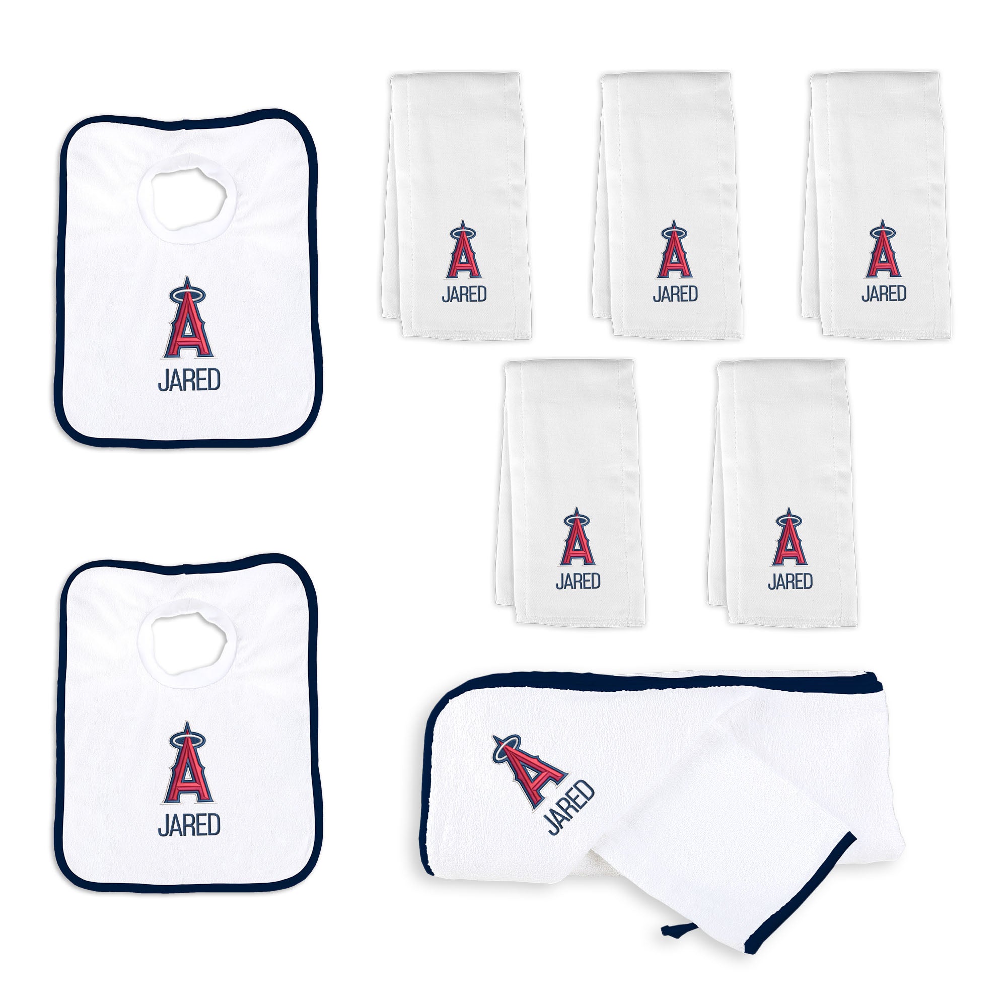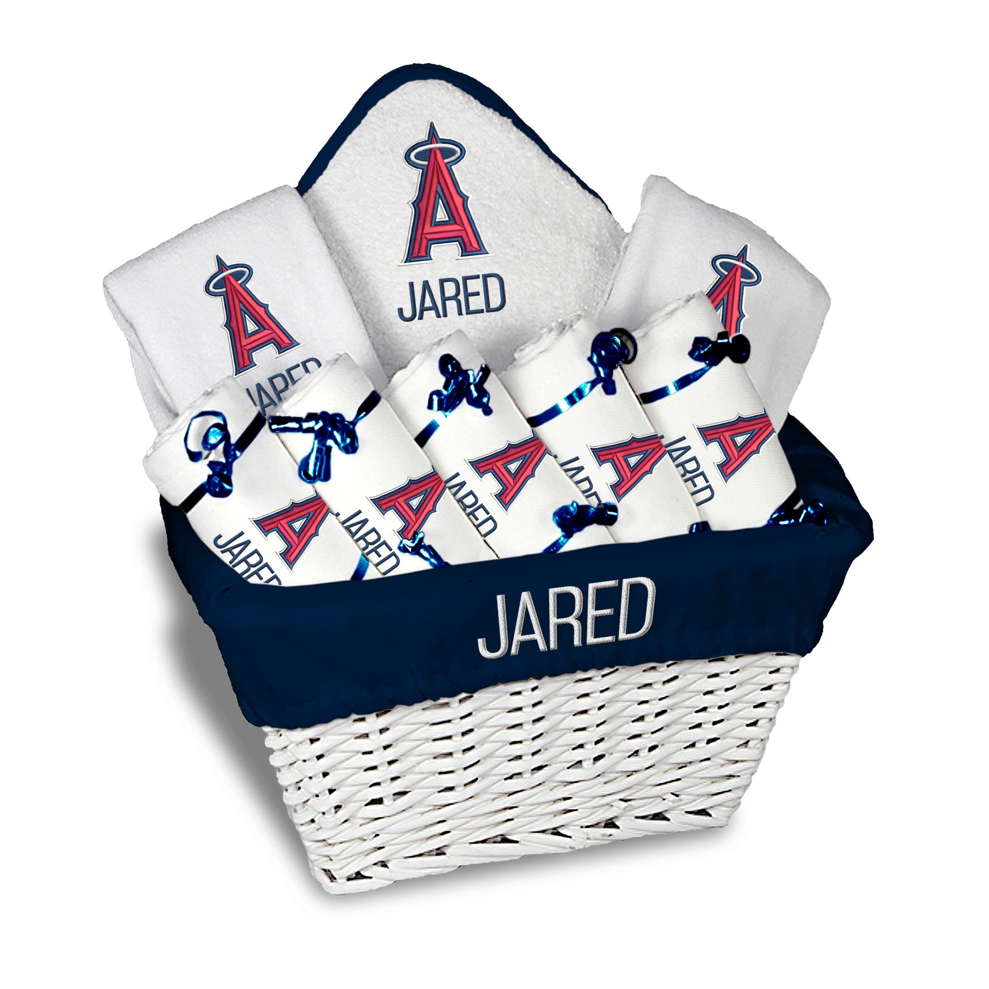 Our Personalized LA Angels Large Gift Basket contains an assortment of our best-selling items packaged in a white willow basket with a personalized cotton liner.  Each basket holds five of our 100% cotton burp cloths, two 100% cotton terry pullover bibs, and one 100% cotton terry hooded towel and wash mitt. The burp cloths, bibs and hooded towel are each embroidered with the Angels logo and baby’s name or nickname; the basket liner is embroidered with the baby’s name.