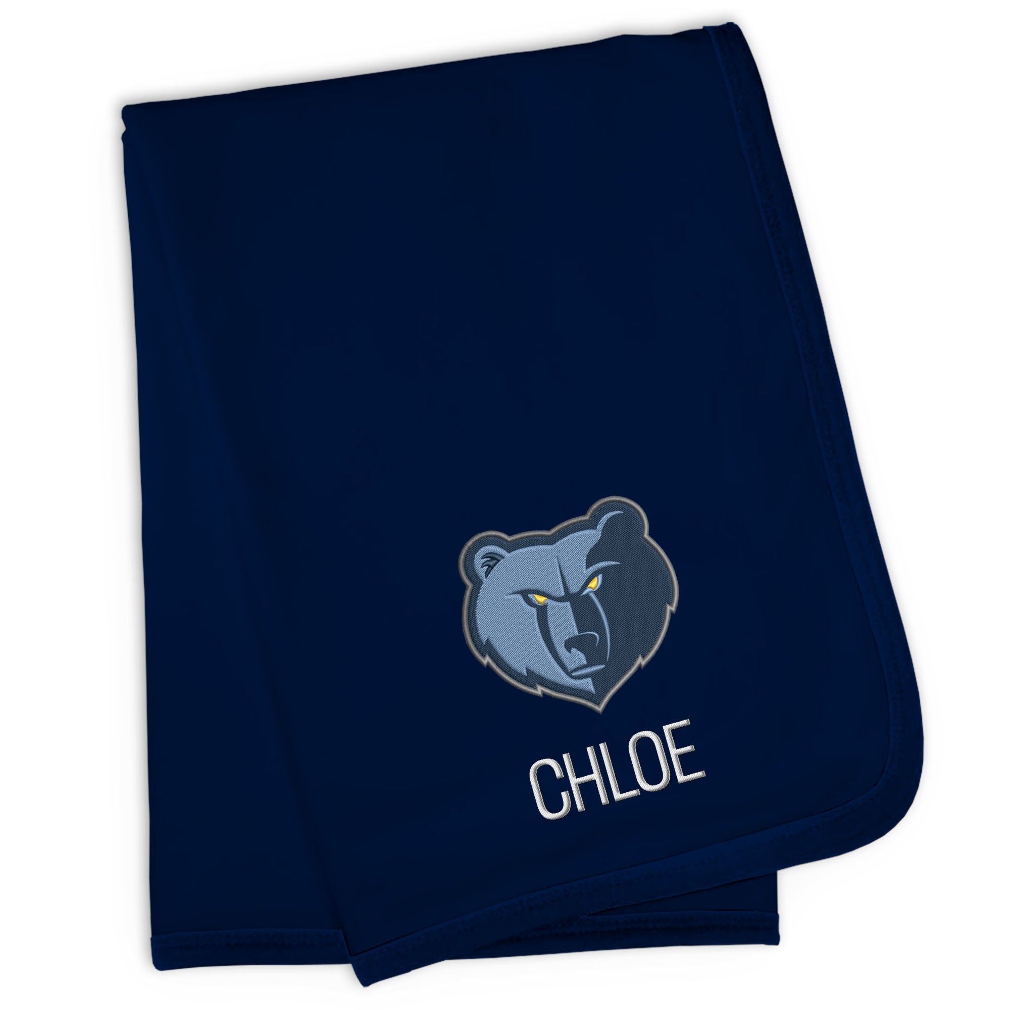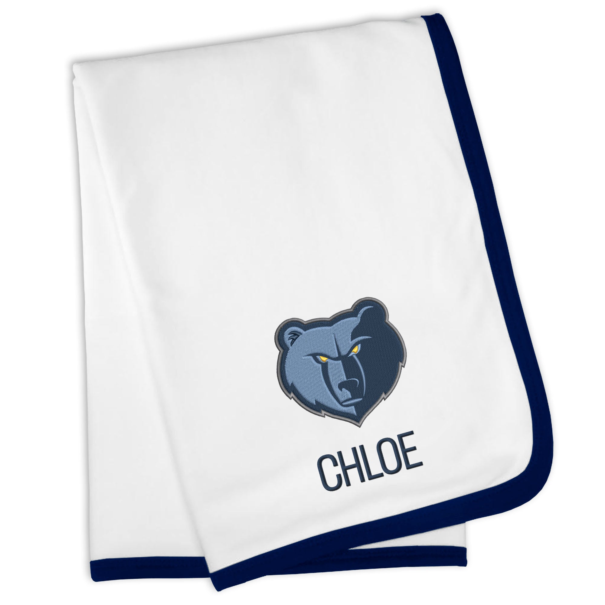 Our Personalized Memphis Grizzlies Blanket is sized just right for a baby basketball fan. Constructed from super soft 100% cotton jersey knit and trimmed in Grizzlies team colors, this blanket is perfect for walks in the stroller or swaddling at bedtime. Each blanket is embroidered with the official Grizzlies logo and your little one’s name or nickname.