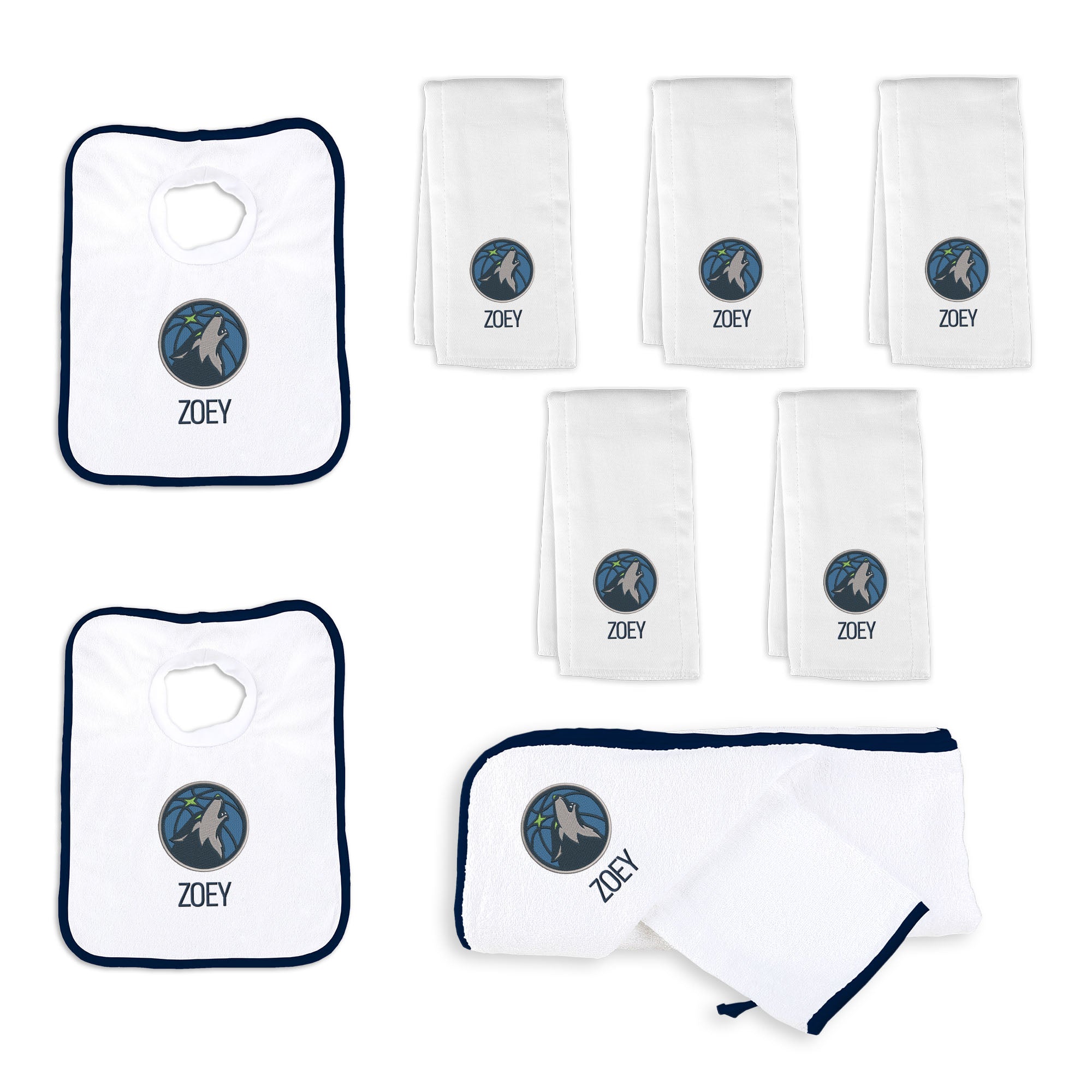 Our Personalized Minnesota Timberwolves Large Gift Basket contains an assortment of our best-selling items packaged in a white willow basket with a personalized cotton liner. Each basket holds five of our 100% cotton burp cloths, two 100% cotton terry pullover bibs, and one 100% cotton terry hooded towel and wash mitt. The burp cloths, bibs and hooded towel are each embroidered with the Timberwolves logo and baby’s name or nickname; the basket liner is embroidered with the baby’s name.