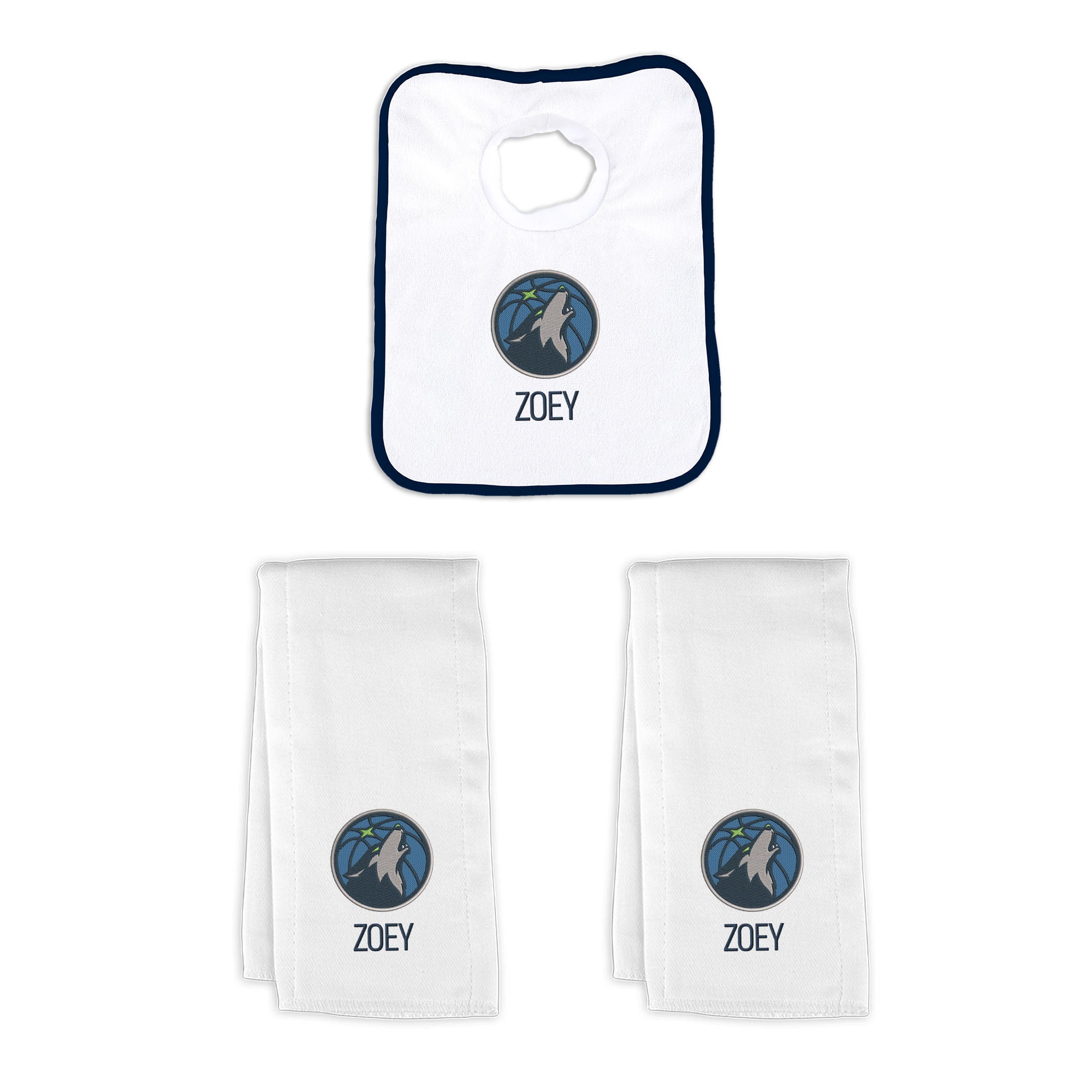 Our Personalized Minnesota Timberwolves Small Gift Basket contains 3 of our best-selling items packaged in a white willow basket with a personalized cotton liner.  Each basket holds 2 of our 100% cotton burp cloths and a 100% cotton terry pullover bib. each piece is embroidered with the official Timberwolves logo and baby's name or nickname.