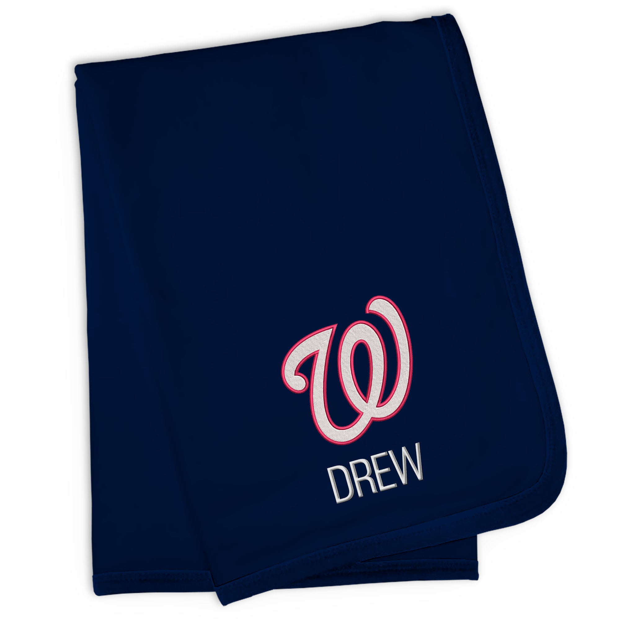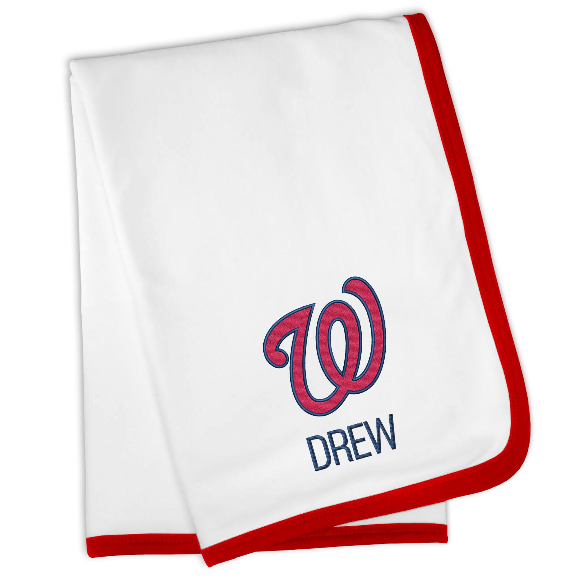 The littlest fan in your life will love snuggling up to watch some baseball with their very own personalized blanket. Each Nationals blanket measures 30" x 36" and is customized with a name or phrase of your choice making it the perfect size for little ones to snuggle with. This blanket is also great to have on hand in the car or anywhere your little one wants to have something to wrap up in while they show their team spirit! The blanket is 100% cotton and is machine washable and dryer safe.
