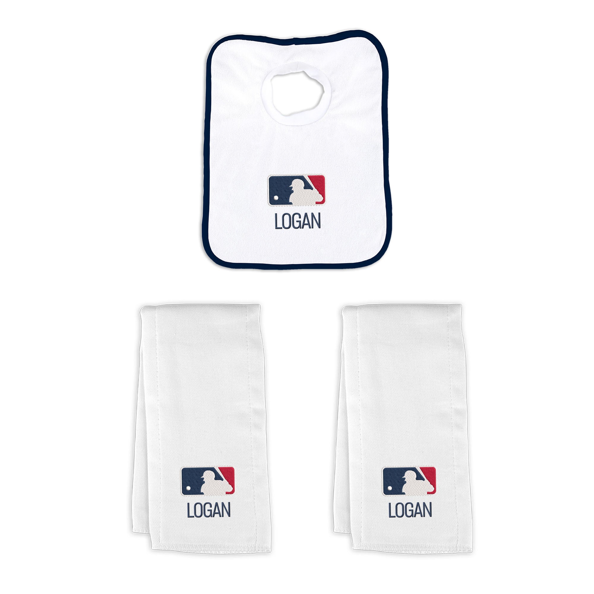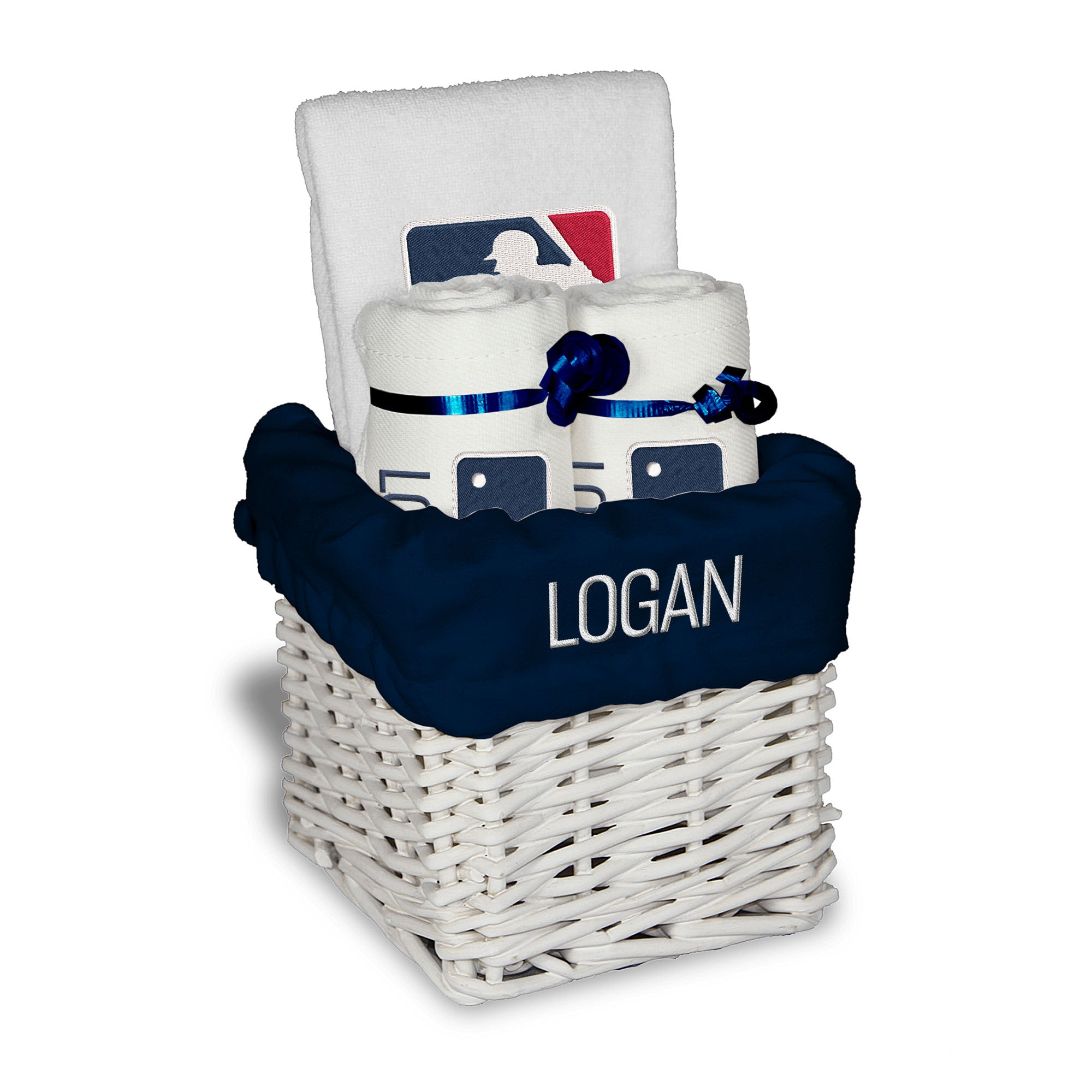 Our Personalized MLB Batter Small Gift Basket contains 3 of our best-selling items packaged in a white willow basket with a personalized cotton liner. Each basket holds 2 of our 100% cotton burp cloths and a 100% cotton terry pullover bib. each piece is embroidered with the official MLB logo and baby's name or nickname.
