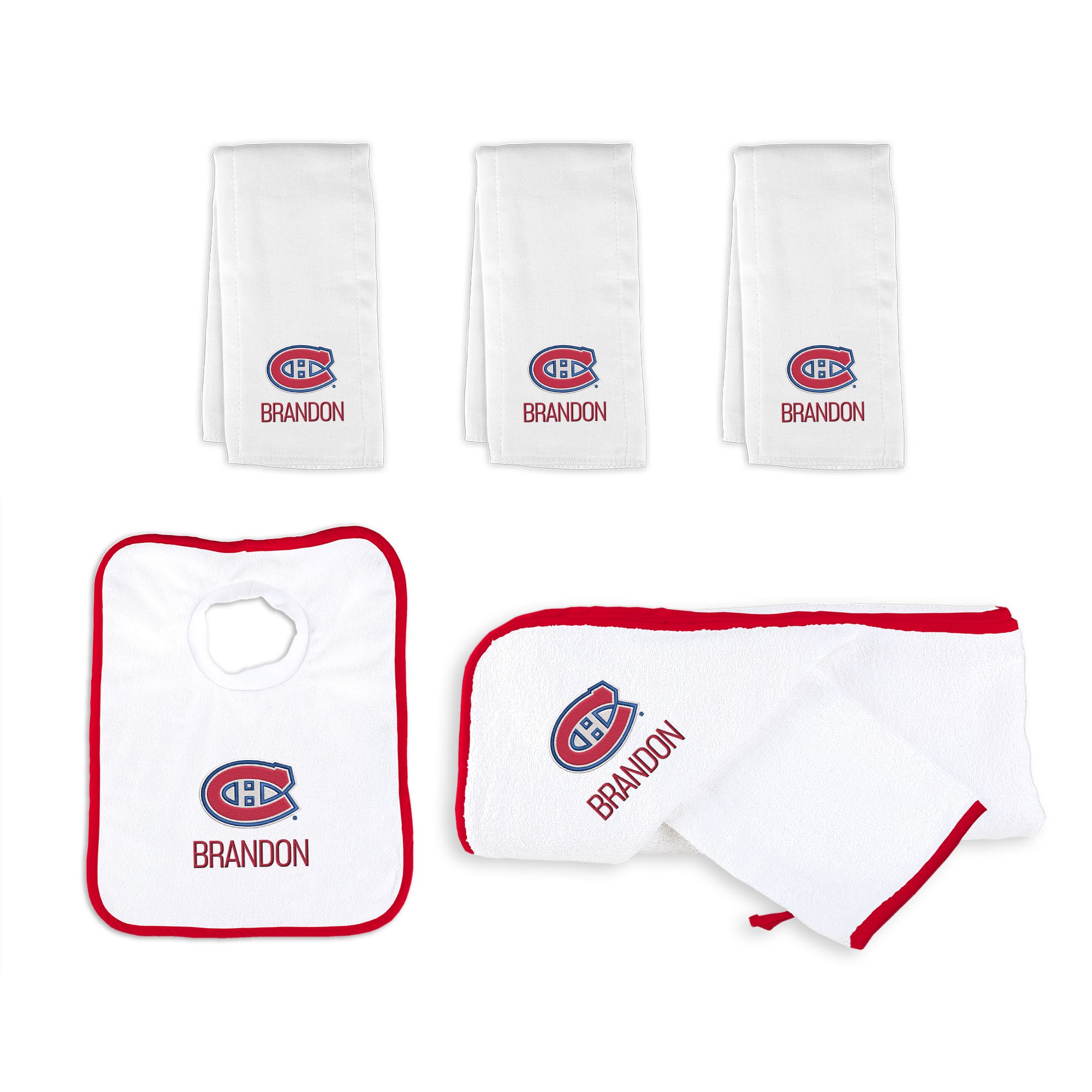 This personalized gift basket contains a trio of 100% cotton burp cloths, a 100% cotton terry pullover bib, and a 100% cotton terry hooded towel with a wash mitt. Each of these high-quality items is expertly embroidered with the iconic Montreal Canadiens logo, making them the ideal choice for young Canadiens fans in the making.