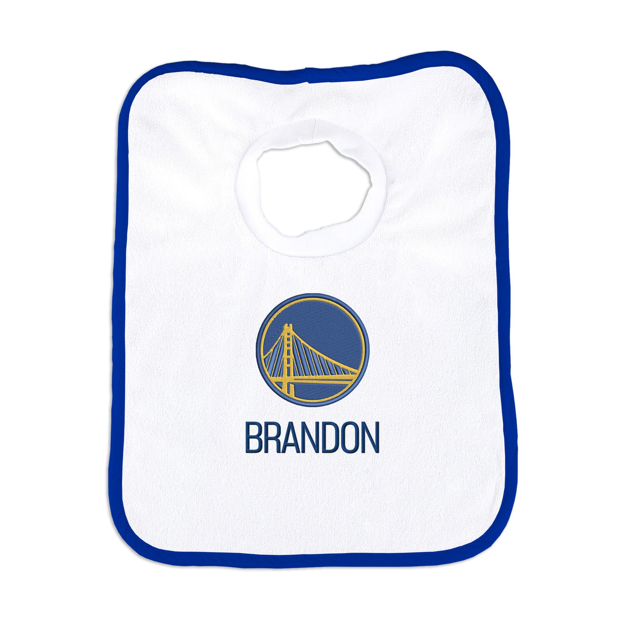 Our Personalized Golden State Warriors Bib is the perfect accessory for every baby Warriors fan. The Warriors bib slips on easily over baby’s head, with a neck hole that is specially designed for extra comfort with super soft, gently gathered stretch cotton. Each bib is embroidered with the Warriors logo and your little one’s name or nickname. Makes a wonderful gift for new Warriors babies and their families.