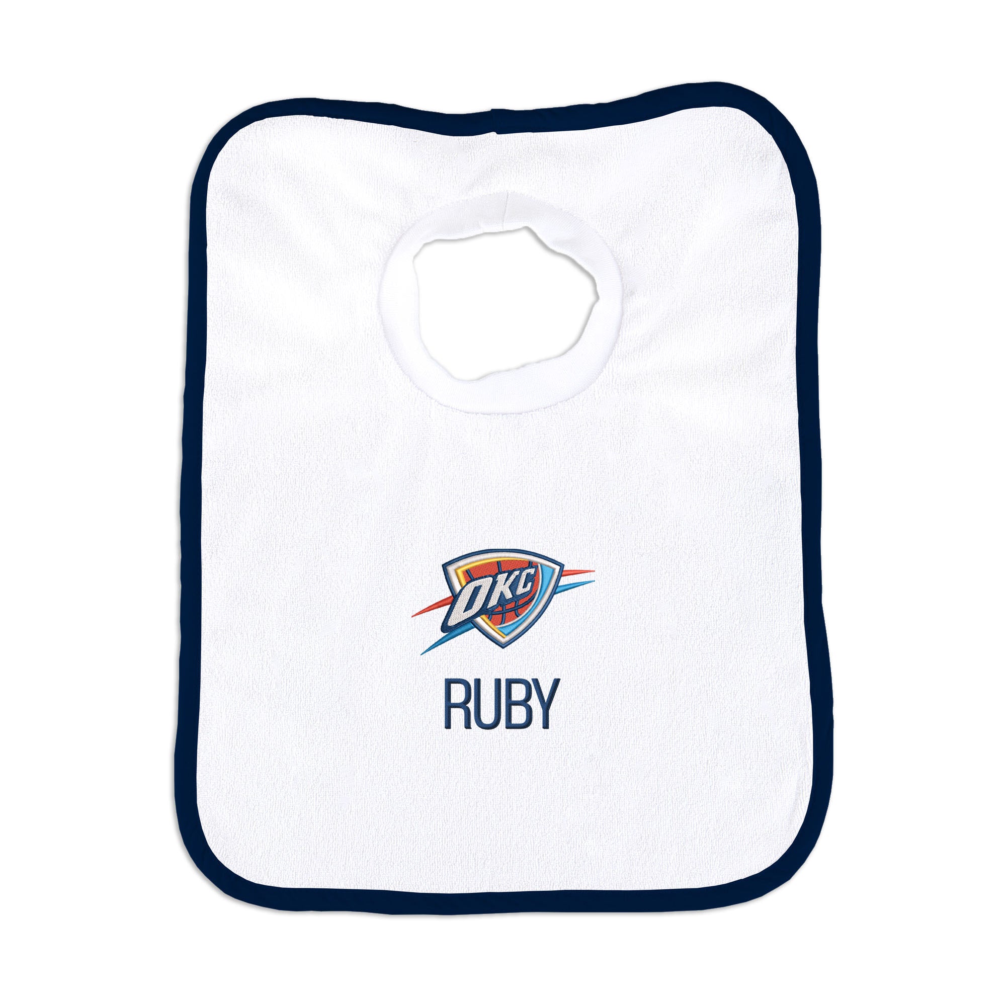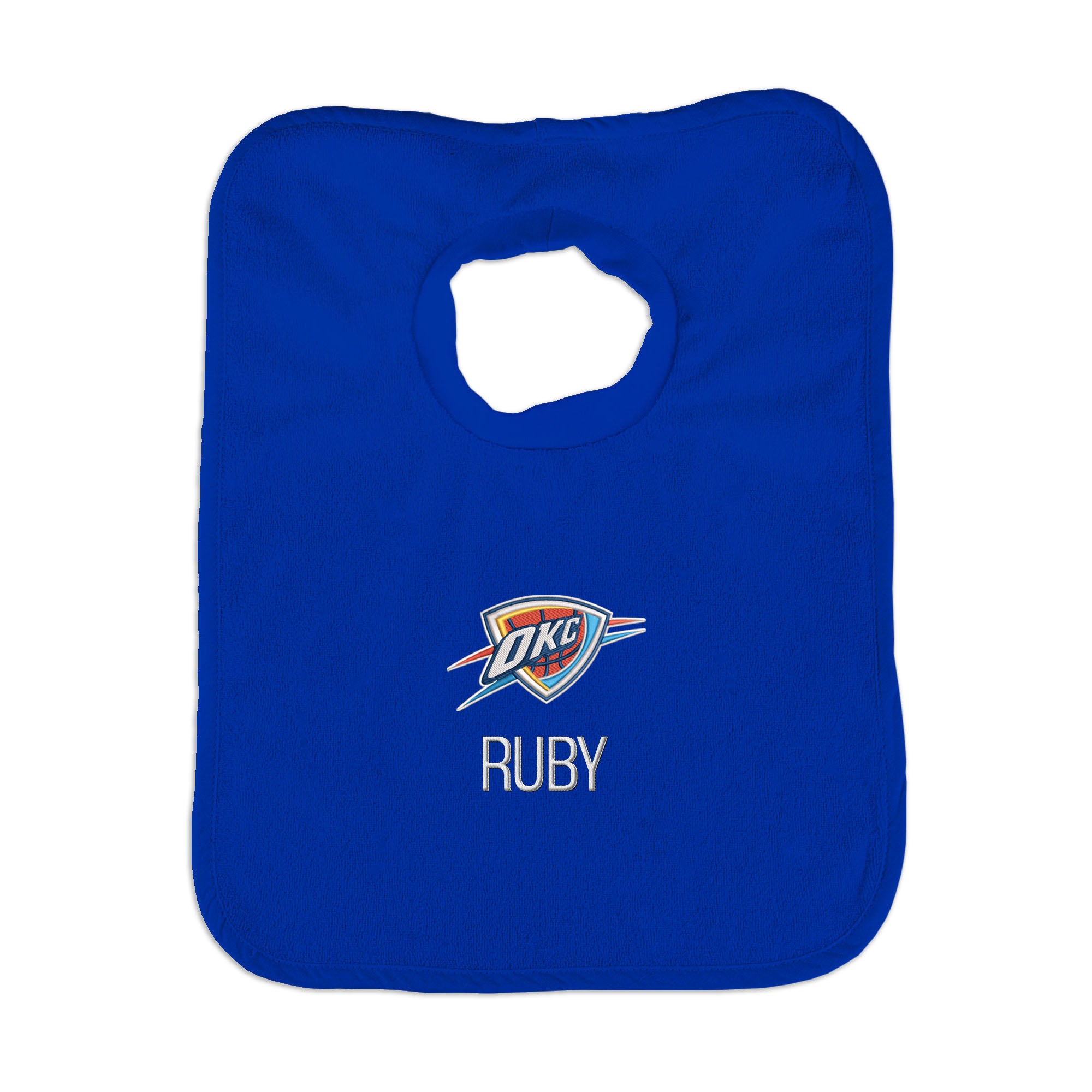 Our Personalized Oklahoma City Thunder Bib is the perfect accessory for every baby Thunder fan. The Thunder bib slips on easily over baby’s head, with a neck hole that is specially designed for extra comfort with super soft, gently gathered stretch cotton. Each bib is embroidered with the Thunder logo and your little one’s name or nickname. Makes a wonderful gift for new Thunder babies and their families.