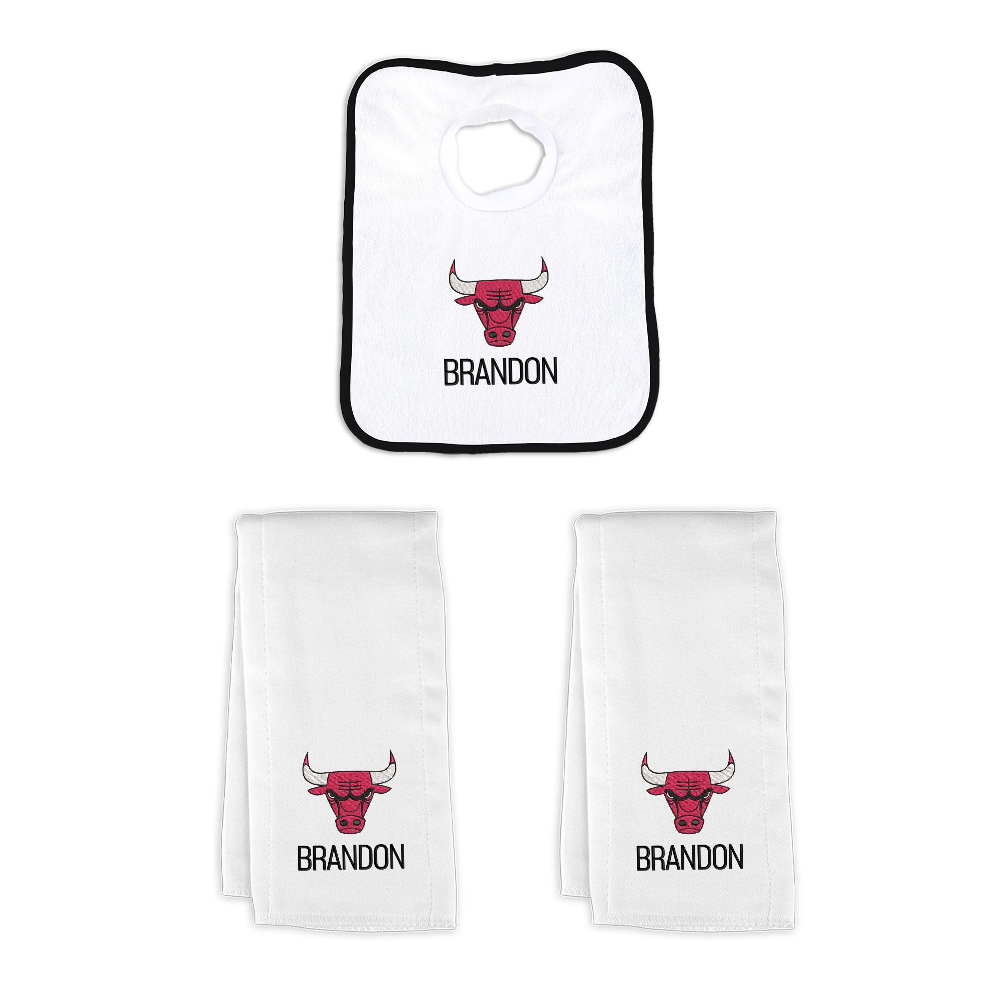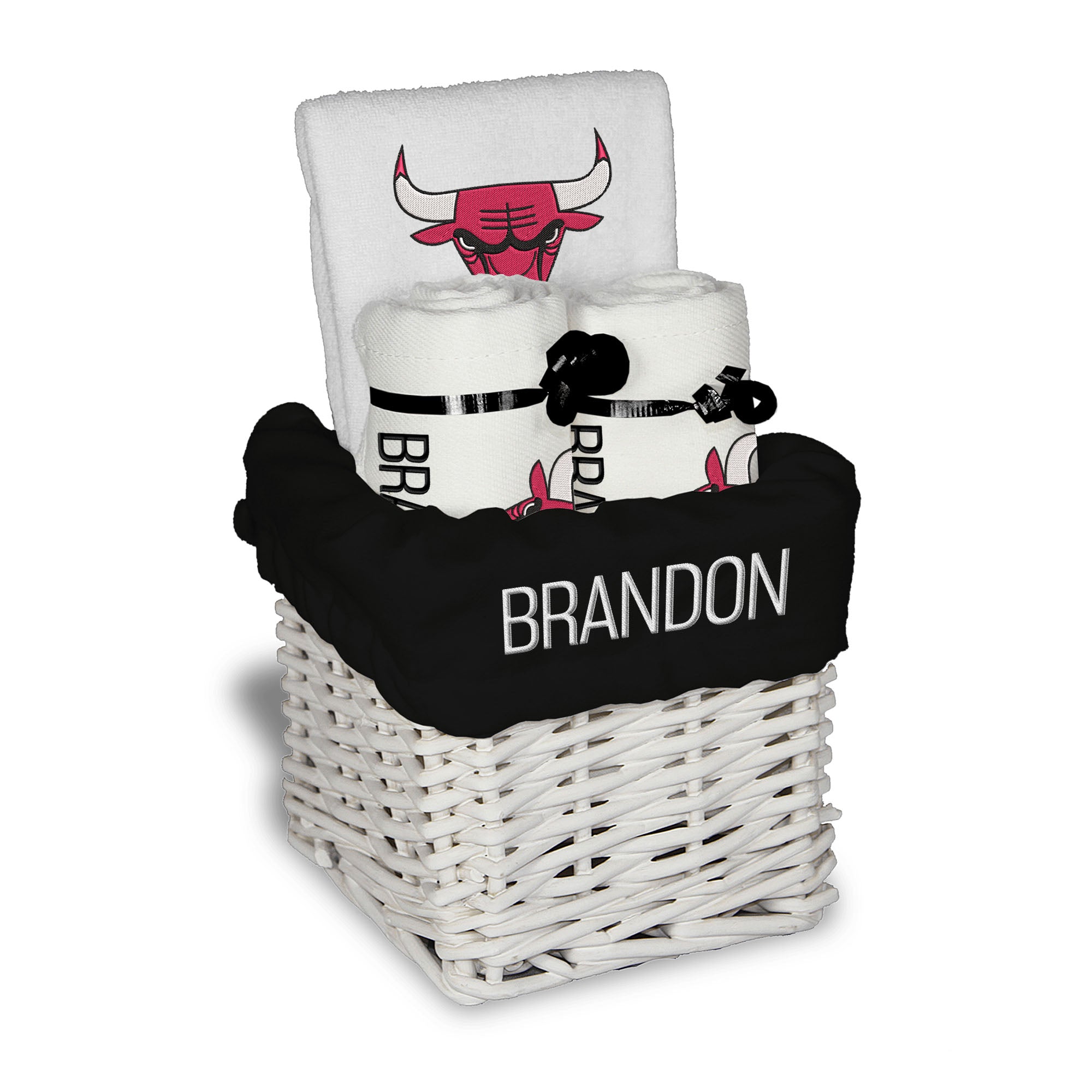Our Personalized Chicago Bulls Small Gift Basket contains 3 of our best-selling items packaged in a white willow basket with a personalized cotton liner. Each basket holds 2 of our 100% cotton burp cloths and a 100% cotton terry pullover bib. each piece is embroidered with the official Bulls logo and baby's name or nickname.
