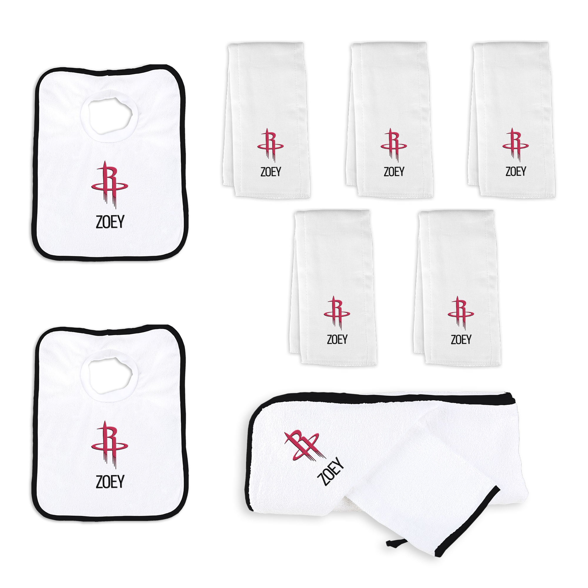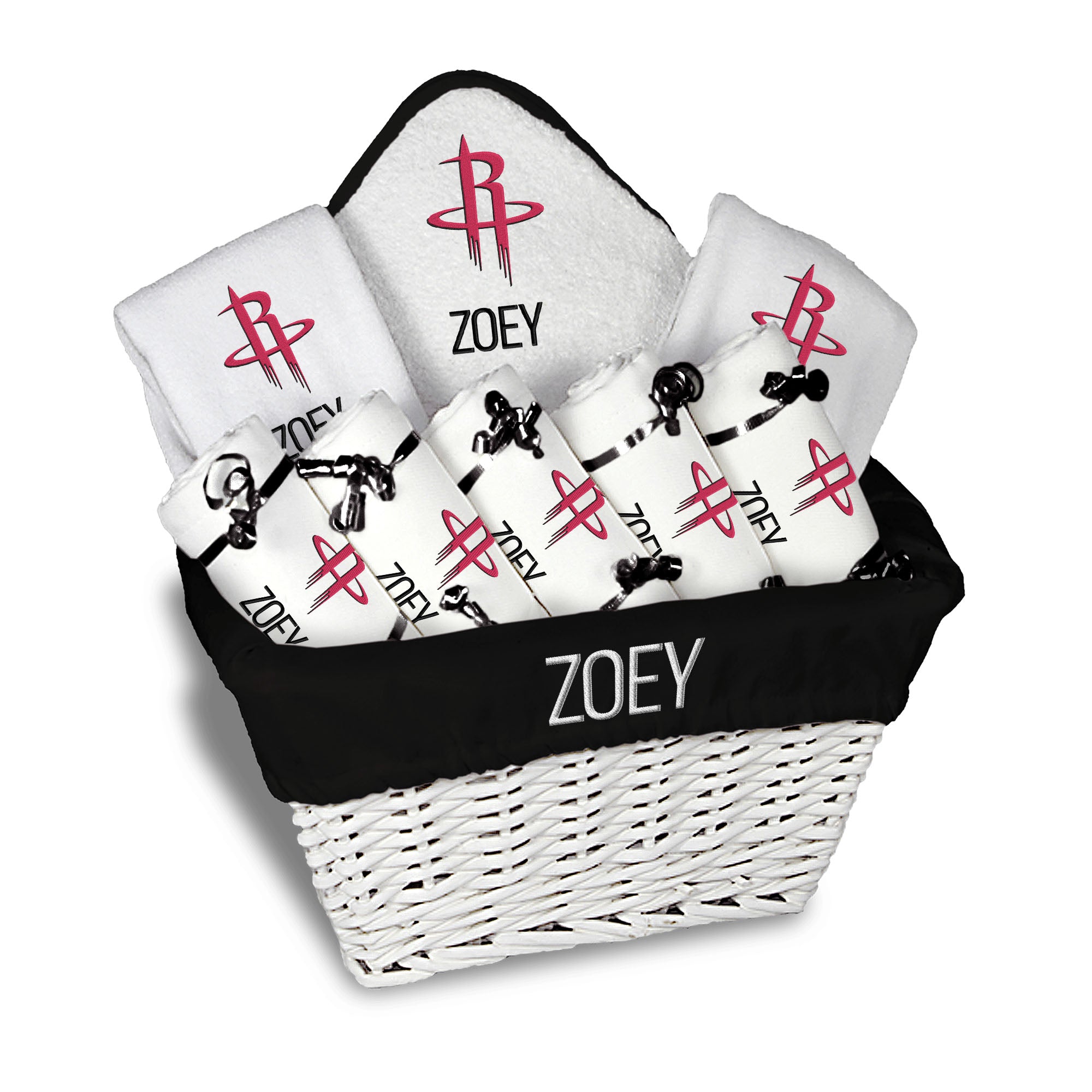 Our Personalized Houston Rockets Large Gift Basket contains an assortment of our best-selling items packaged in a white willow basket with a personalized cotton liner. Each basket holds five of our 100% cotton burp cloths, two 100% cotton terry pullover bibs, and one 100% cotton terry hooded towel and wash mitt. The burp cloths, bibs and hooded towel are each embroidered with the Rockets logo and baby’s name or nickname; the basket liner is embroidered with the baby’s name.