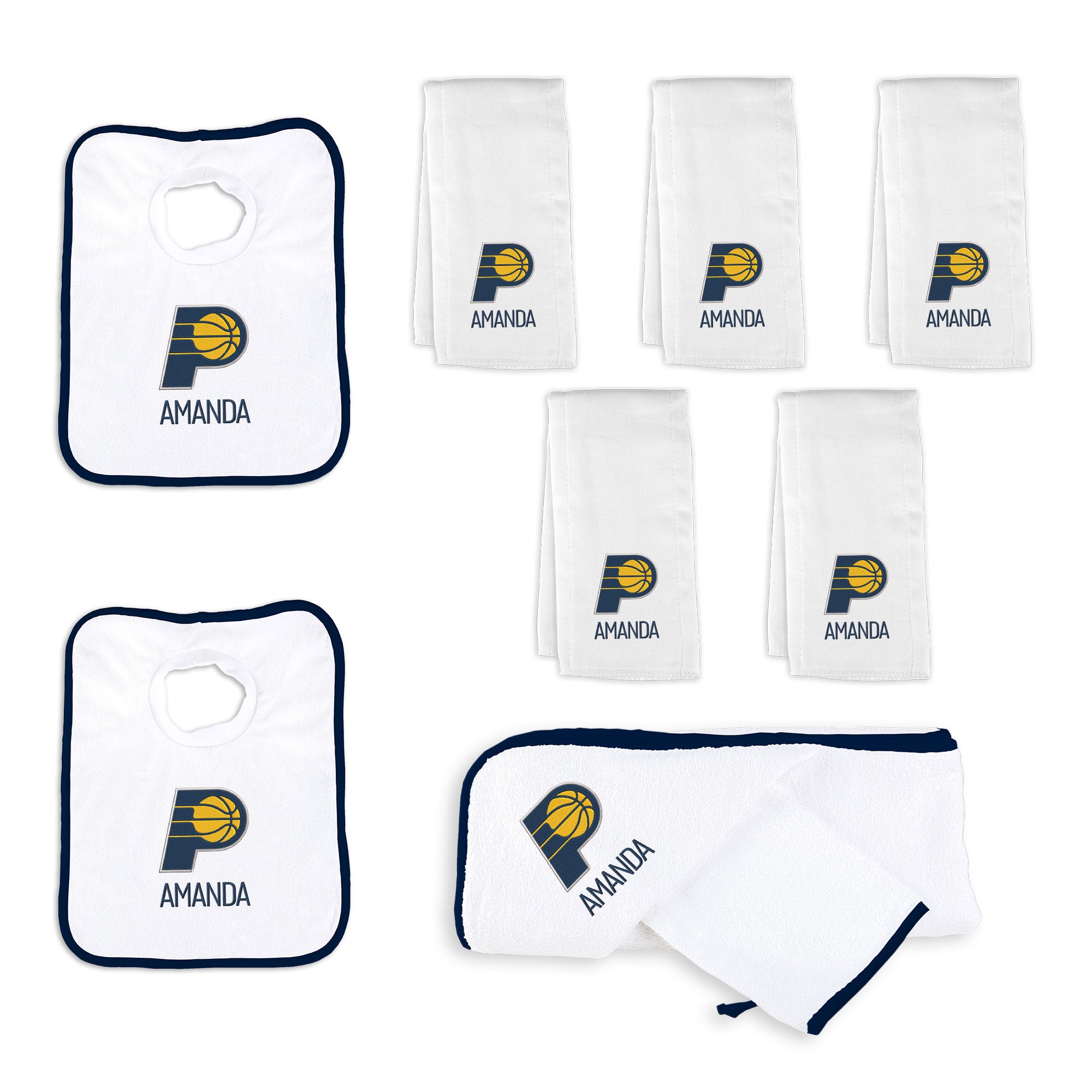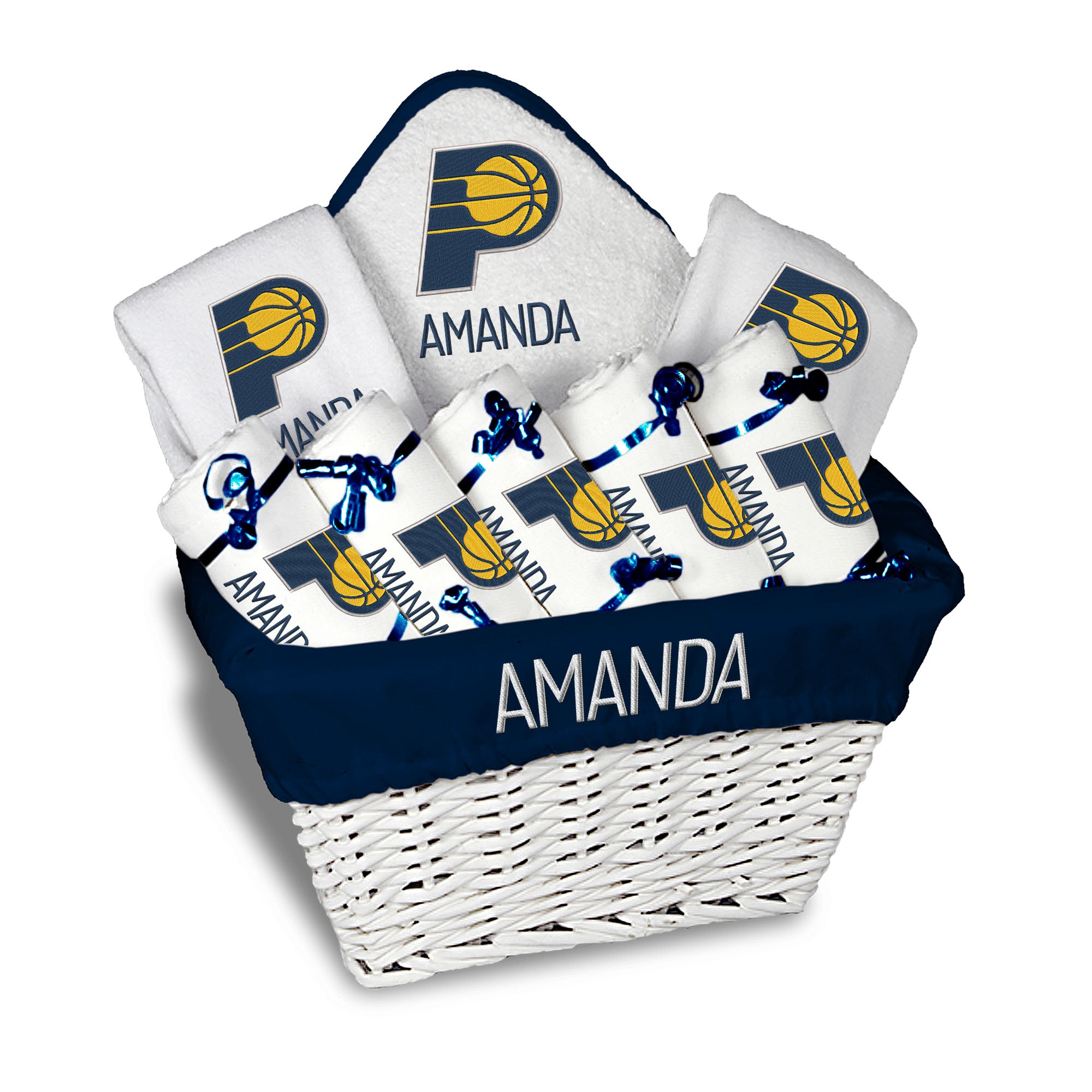 Our Personalized Indiana Pacers Large Gift Basket contains an assortment of our best-selling items packaged in a white willow basket with a personalized cotton liner. Each basket holds five of our 100% cotton burp cloths, two 100% cotton terry pullover bibs, and one 100% cotton terry hooded towel and wash mitt. The burp cloths, bibs and hooded towel are each embroidered with the Pacers logo and baby’s name or nickname; the basket liner is embroidered with the baby’s name.