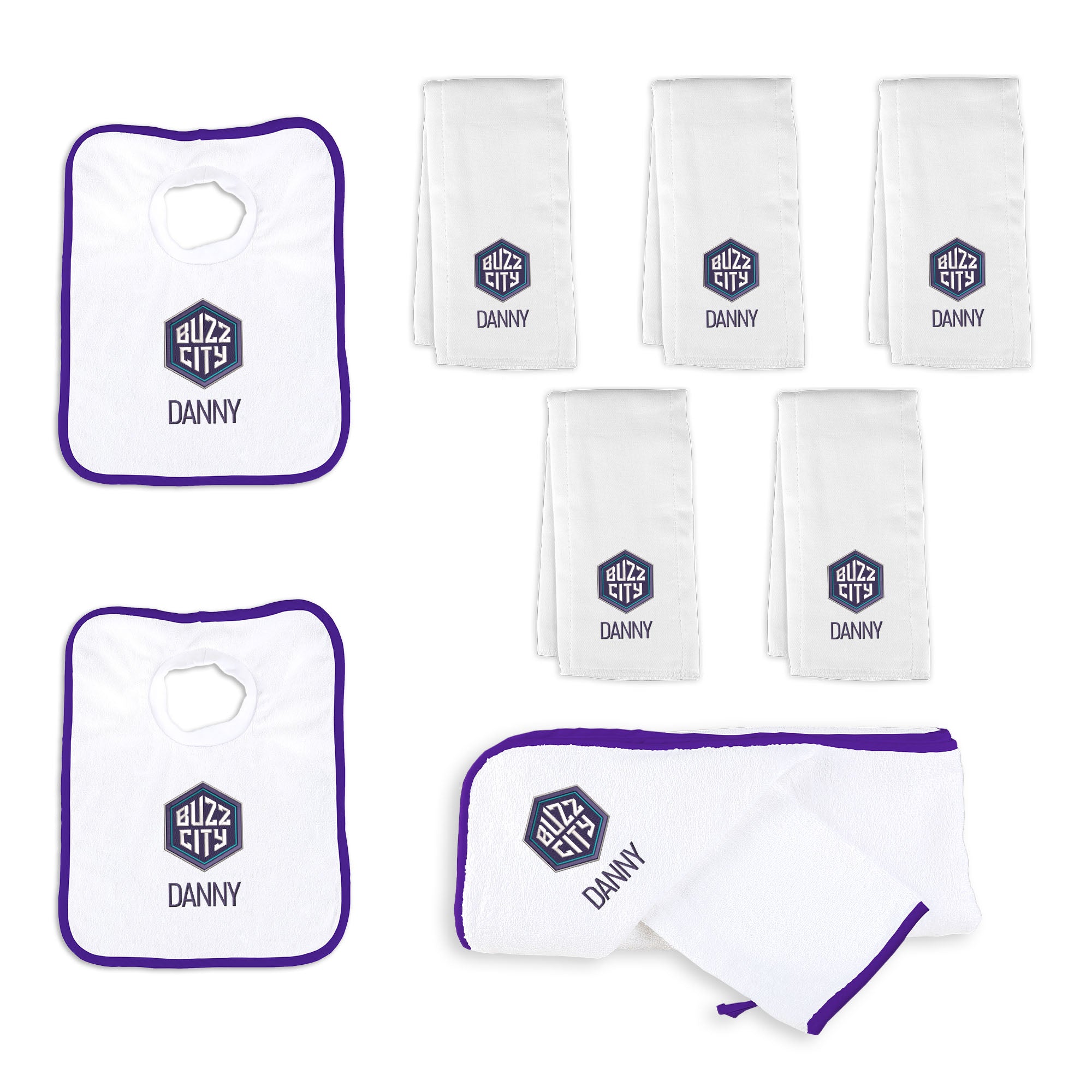 Our Personalized Charlotte Hornets Large Gift Basket contains an assortment of our best-selling items packaged in a white willow basket with a personalized cotton liner.  Each basket holds five of our 100% cotton burp cloths, two 100% cotton terry pullover bibs, and one 100% cotton terry hooded towel and wash mitt. The burp cloths, bibs and hooded towel are each embroidered with the Hornets logo and baby’s name or nickname; the basket liner is embroidered with the baby’s name.