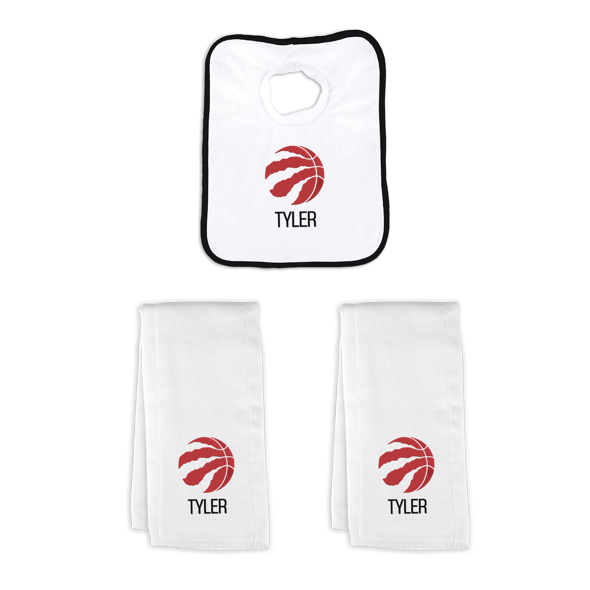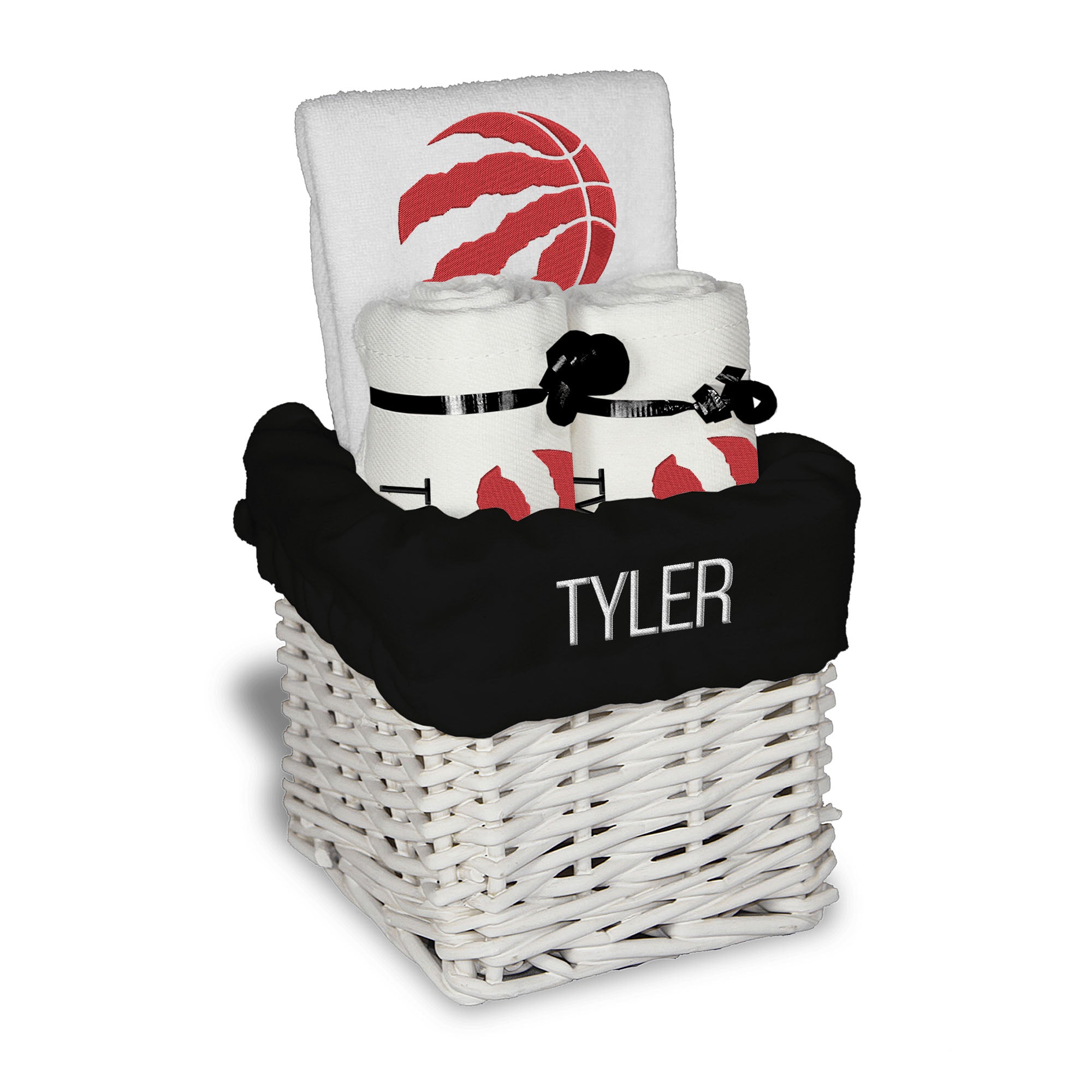 Our Personalized Toronto Raptors Small Gift Basket contains 3 of our best-selling items packaged in a white willow basket with a personalized cotton liner. Each basket holds 2 of our 100% cotton burp cloths and a 100% cotton terry pullover bib. each piece is embroidered with the official Raptors logo and baby's name or nickname.