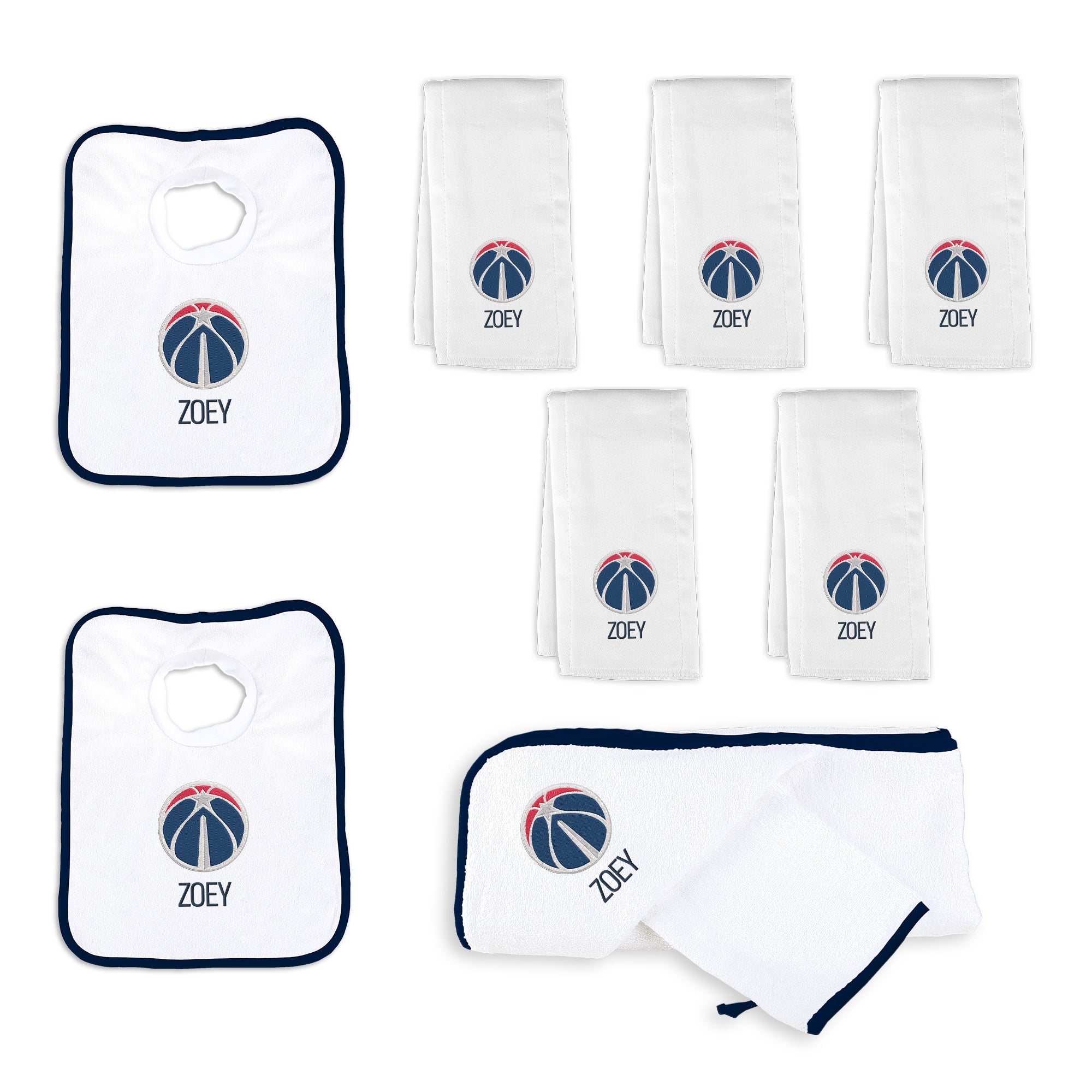 Our Personalized Washington Wizards Large Gift Basket contains an assortment of our best-selling items packaged in a white willow basket with a personalized cotton liner. Each basket holds five of our 100% cotton burp cloths, two 100% cotton terry pullover bibs, and one 100% cotton terry hooded towel and wash mitt. The burp cloths, bibs and hooded towel are each embroidered with the Wizards logo and baby’s name or nickname; the basket liner is embroidered with the baby’s name.