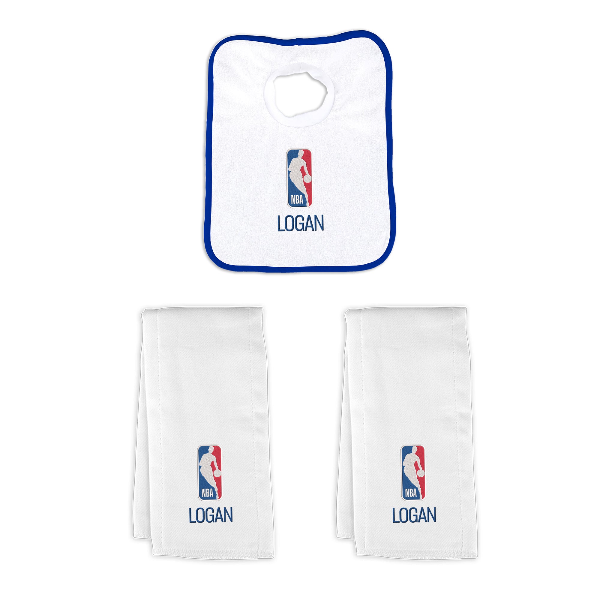 Our Personalized NBA Logoman Small Gift Basket contains 3 of our best-selling items packaged in a white willow basket with a personalized cotton liner. Each basket holds 2 of our 100% cotton burp cloths and a 100% cotton terry pullover bib. each piece is embroidered with the official NBA logo and baby's name or nickname.
