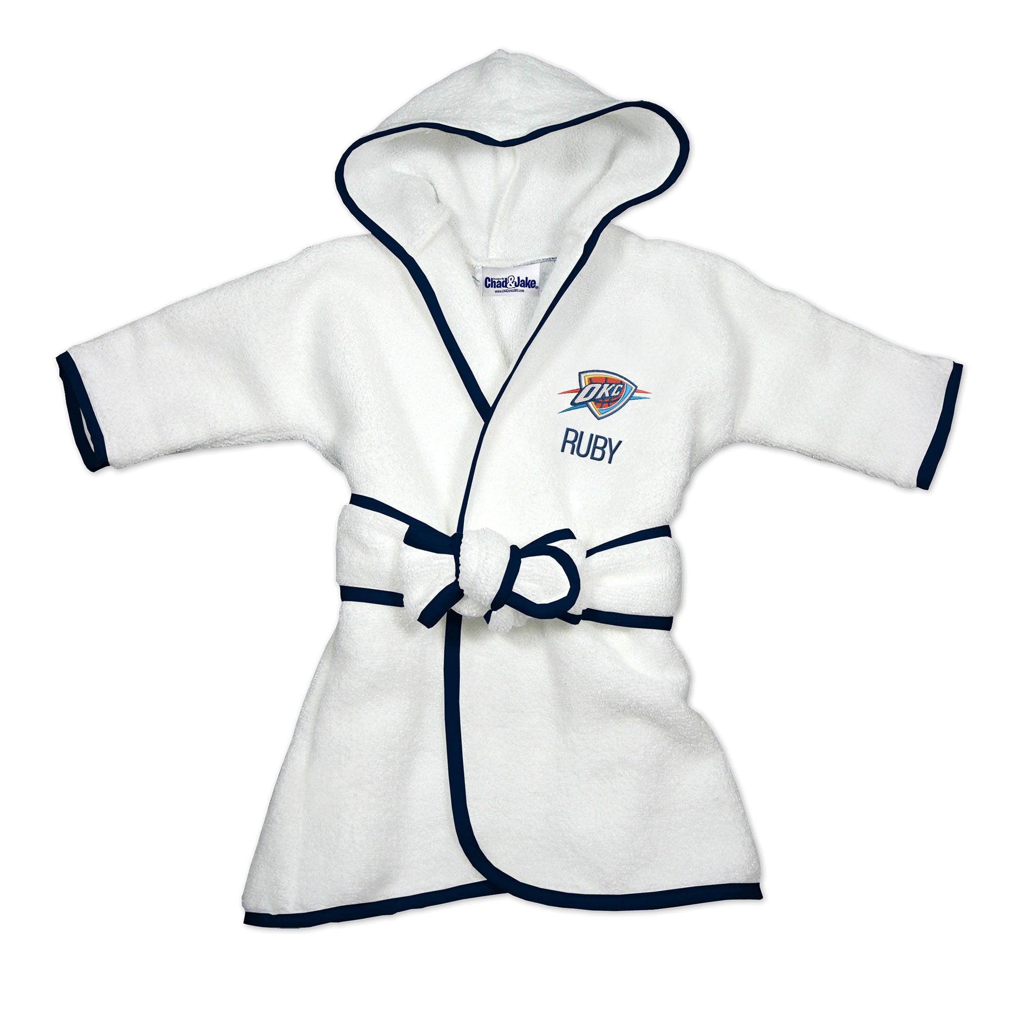Our Personalized Oklahoma City Thunder Infant Robe is a fun and practical accessory for every little Thunder fan. Each robe is embroidered with the official Oklahoma City Thunder logo and your own little one’s name or nickname. What a great way for even the youngest fans to support their team and show Thunder pride! Kids can wrap up after a bath or shower, cover up and dry off after swimming, or relax at home in the comfort of this plush Thunder robe sized just for them.
