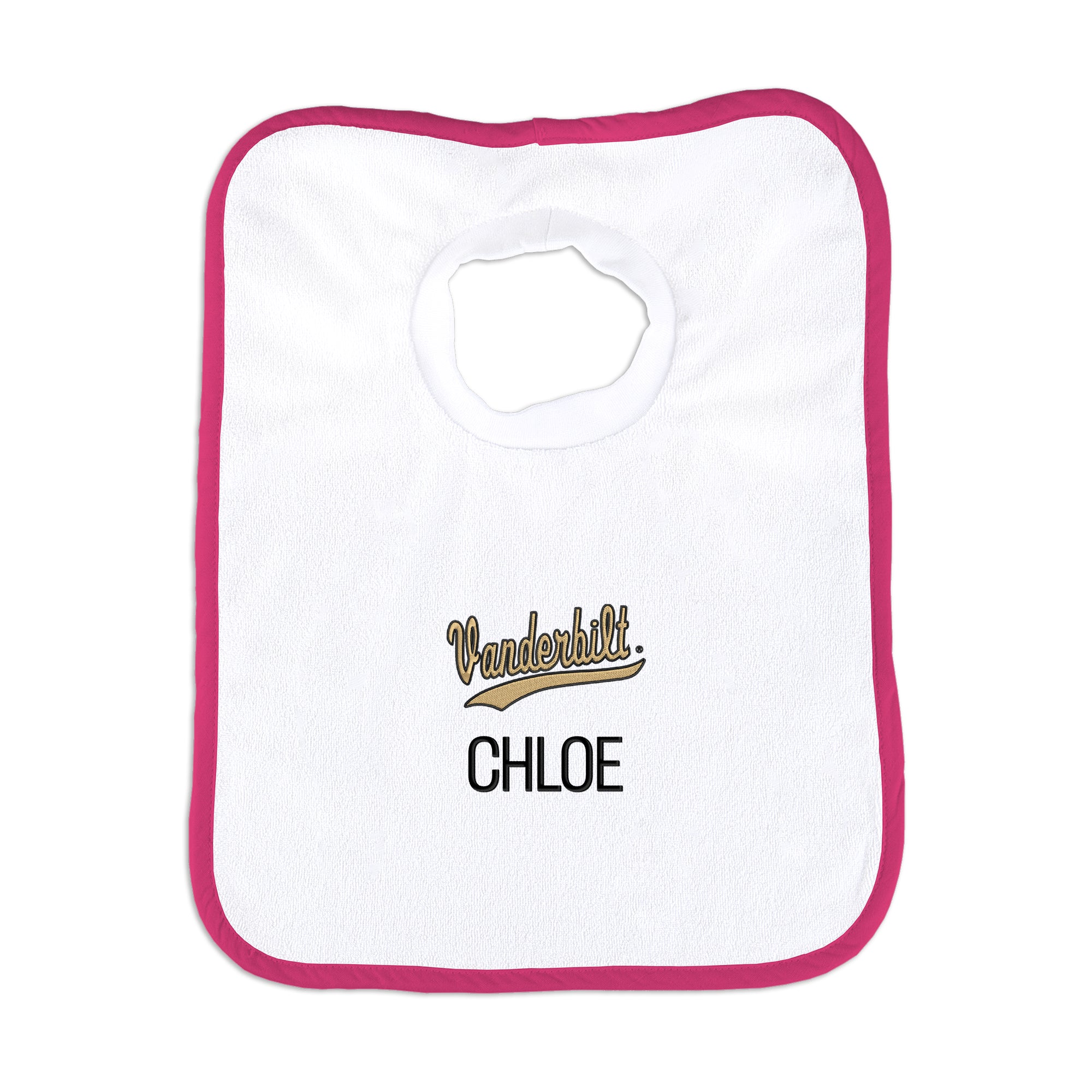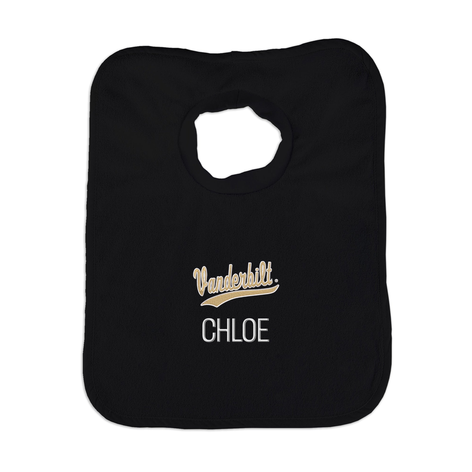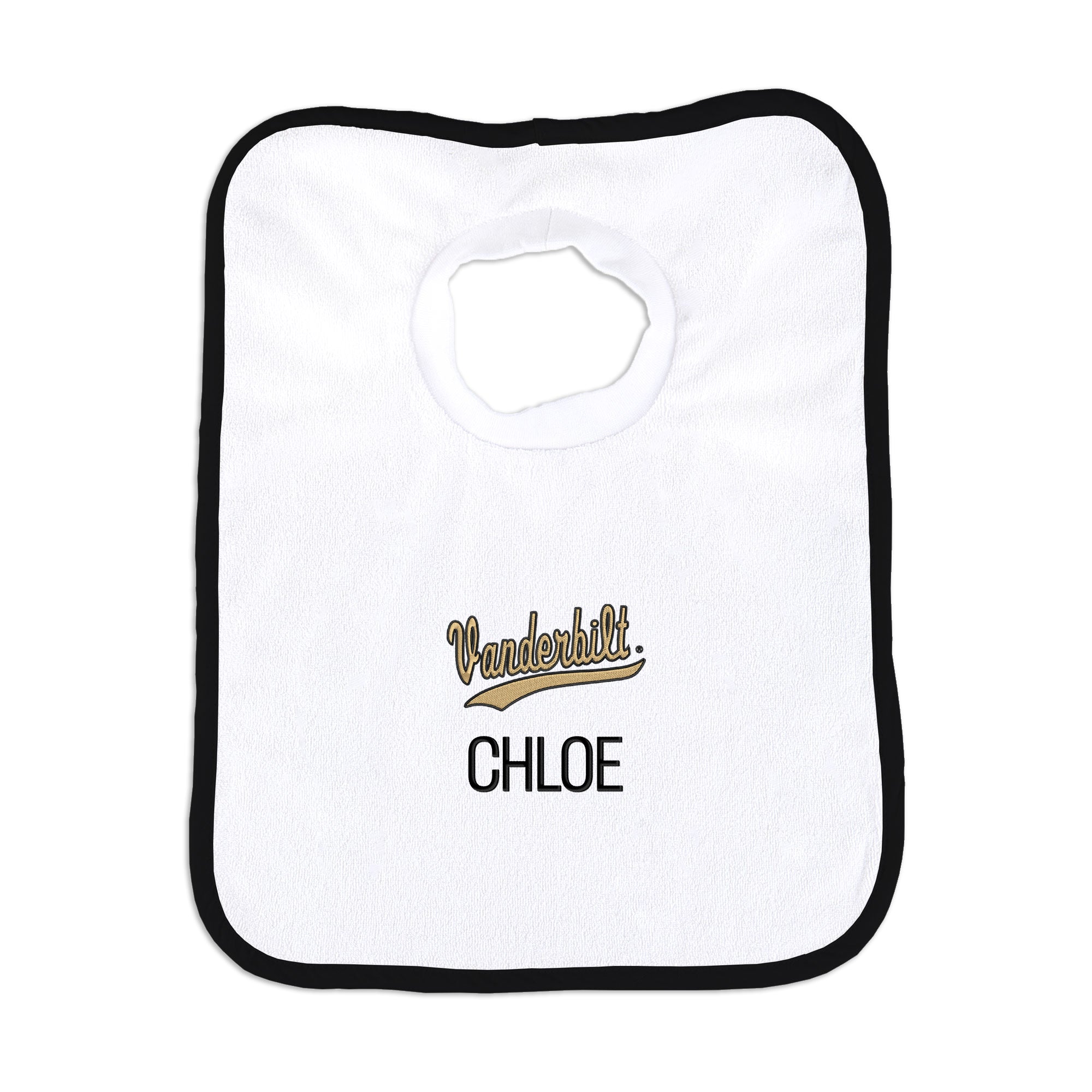 Dress your little Commodore in style with our Personalized Vanderbilt Commodores Pullover Bib. This bib is a game day essential for your little fan! Crafted from stretch terry cloth, it offers a comfortable and snug fit with its stretchable neck hole. Featuring the iconic Commodores logo, officially licensed by the university, this bib adds a touch of team spirit to every mealtime. Personalize it with your baby's name for an extra special touch. Whether it's for catching dribbles or spills, this pullover bib combines functionality with team pride seamlessly. Order the Personalized Vanderbilt Commodores Pullover Bib today and let your little one showcase their team pride from mealtime to playtime!