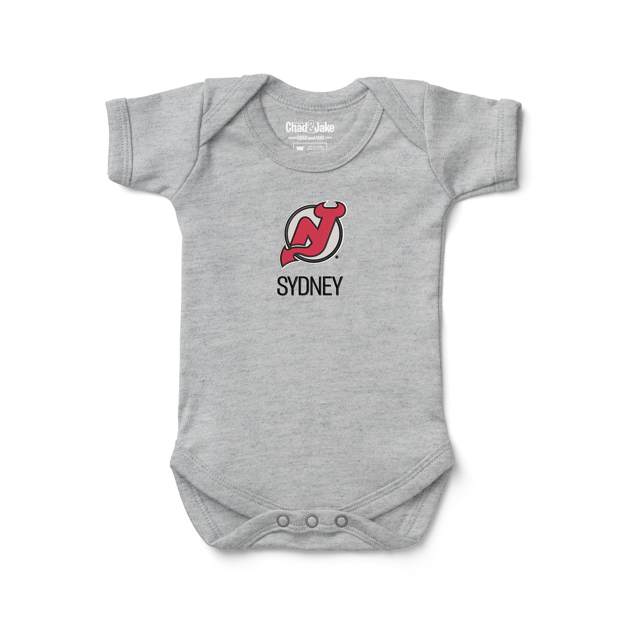 Our New Jersey Devils bodysuit is the perfect way for fans of all ages to show off their team spirit. Made from 100% super-soft interlock cotton, this bodysuit is comfortable and easy to wear. The envelope neck and three-snap closure make it easy to put on and take off, and it's machine washable and tumble dryable for easy care. But the best part about this bodysuit is the personalized embroidery on the front. With the iconic Devils logo and your little one's name, initials, or nickname under the logo, everyone will know where your allegiance lies. Join the ranks of loyal Devils fans at the Prudential Center and cheer on your team to victory. With numerous awards and championships under their belt, including three Stanley Cup titles, the Devils are a force to be reckoned with. Root for your team alongside mascot NJ Devil and legendary players such as Martin Brodeur and Scott Stevens. Get your little one ready to represent the New Jersey Devils in style with this personalized bodysuit. Order yours today and let your team pride shine.