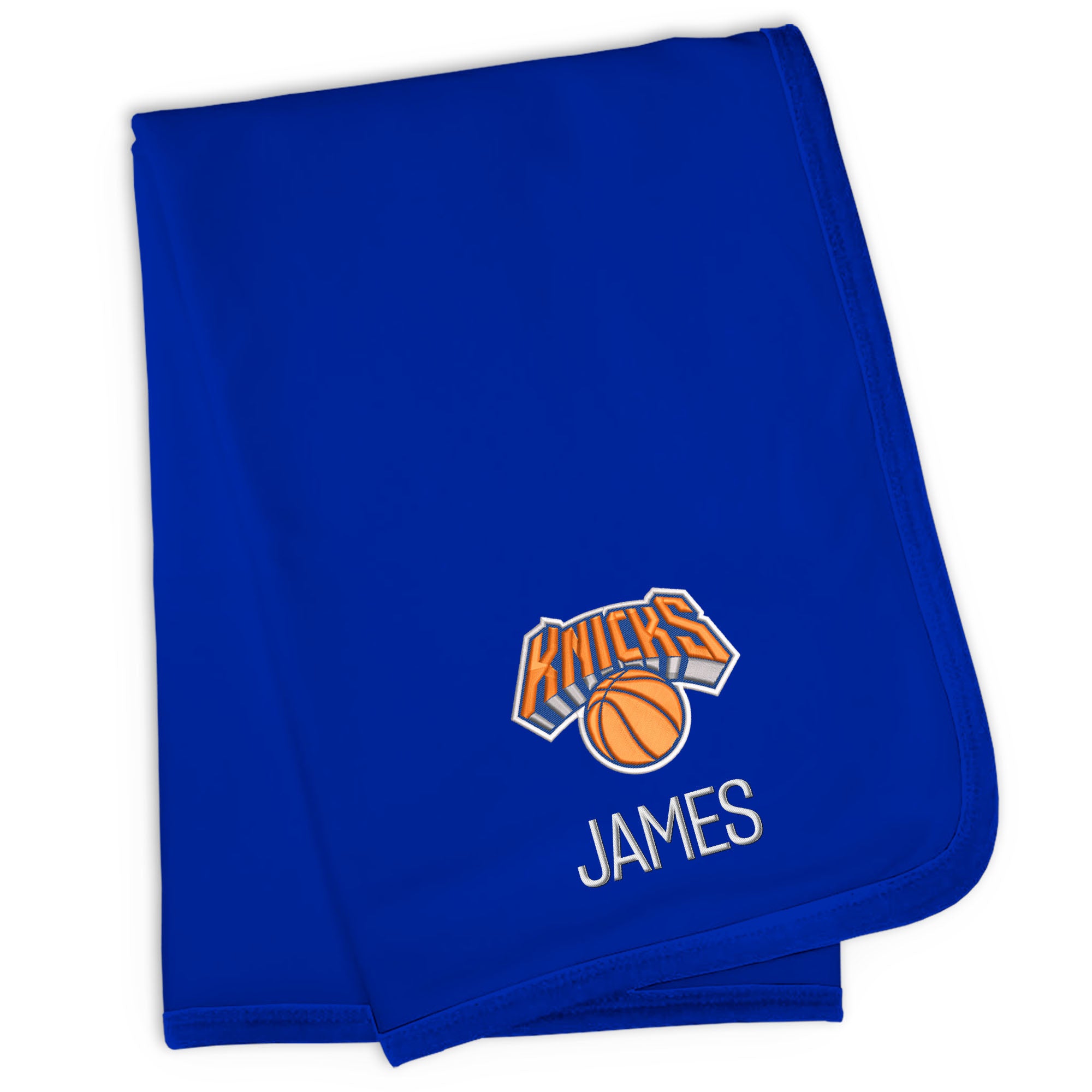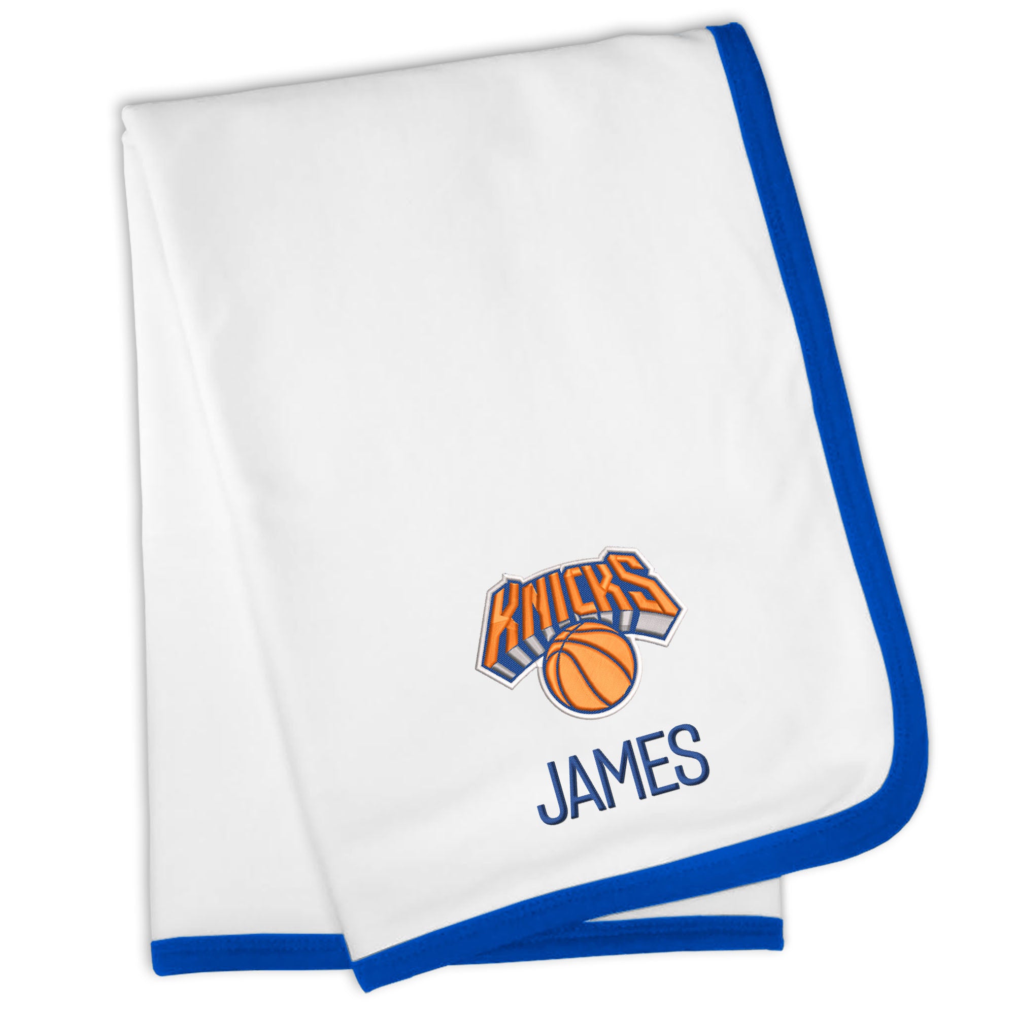 Our Personalized New York Knicks Blanket is sized just right for a baby basketball fan. Constructed from super soft 100% cotton jersey knit and trimmed in Knicks team colors, this blanket is perfect for walks in the stroller or swaddling at bedtime. Each blanket is embroidered with the official Knicks logo and your little one’s name or nickname.