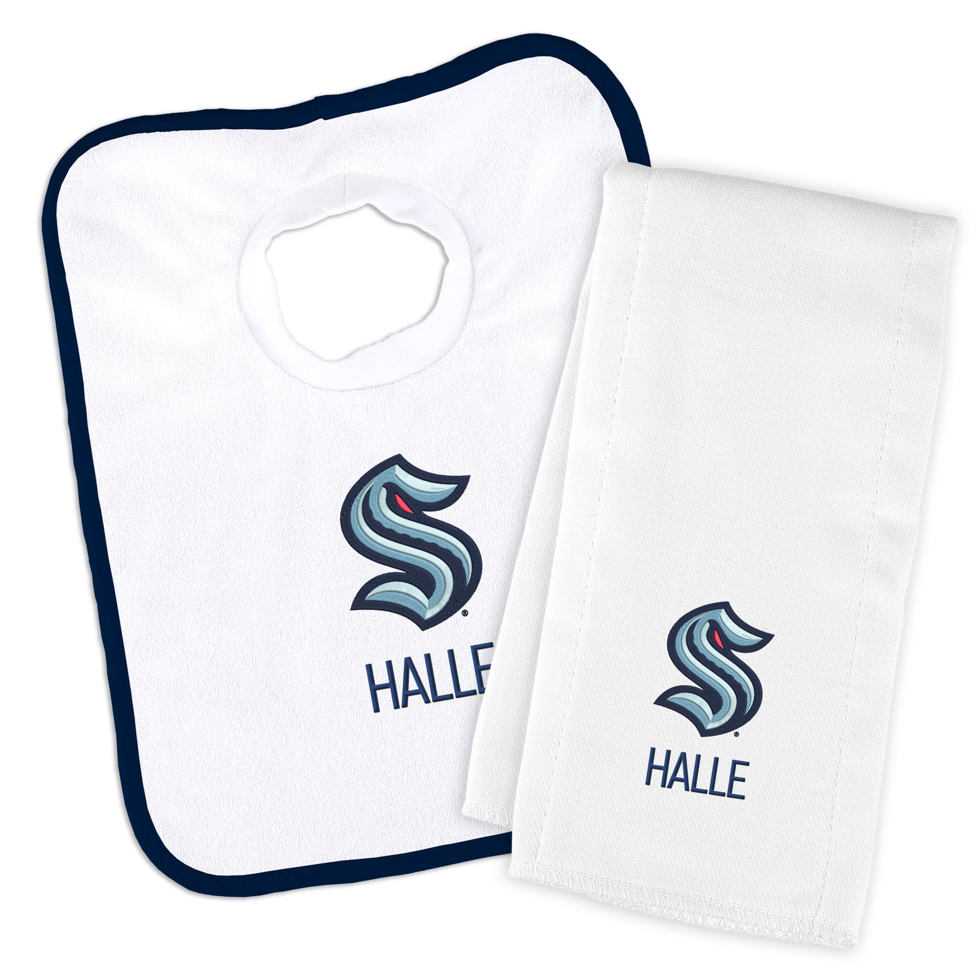 Our Personalized Seattle Kraken Bib and Burp Cloth Set is a thoughtful and useful gift for every baby Kraken fan. The Kraken burp cloth is generously sized and made of soft, absorbent 100% cotton, and the bib has a soft, stretchable cotton neck hole for baby’s comfort. Parents, the bib slips easily over your baby's head and features a soft, gently gathered stretch cotton neck hole for maximum comfort; also, the burp cloth is a must-have asset. Each item features the embroidered logo and the baby's name or nickname underneath.