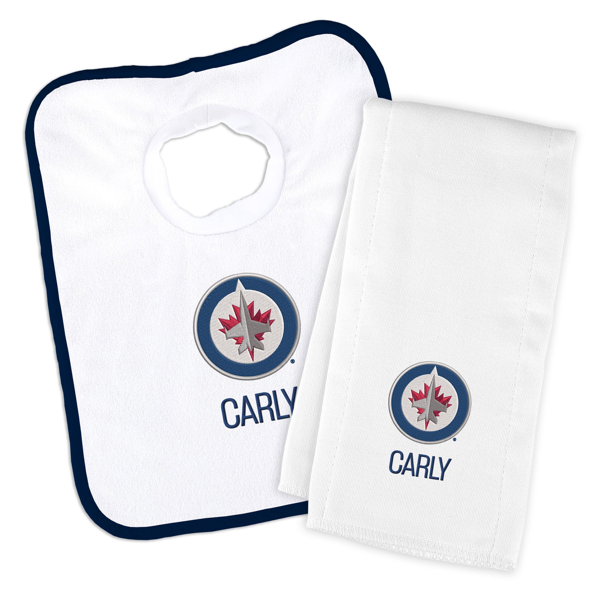 Our Personalized Winnipeg Jets Bib and Burp Cloth Set is a thoughtful and useful gift for every baby Jets fan. The Maple Leafs burp cloth is generously sized and made of soft, absorbent 100% cotton, and the bib has a soft, stretchable cotton neck hole for baby’s comfort. Parents, the bib slips easily over your baby's head and features a soft, gently gathered stretch cotton neck hole for maximum comfort; also, the burp cloth is a must-have asset. Each item features the embroidered logo and the baby's name or nickname underneath.