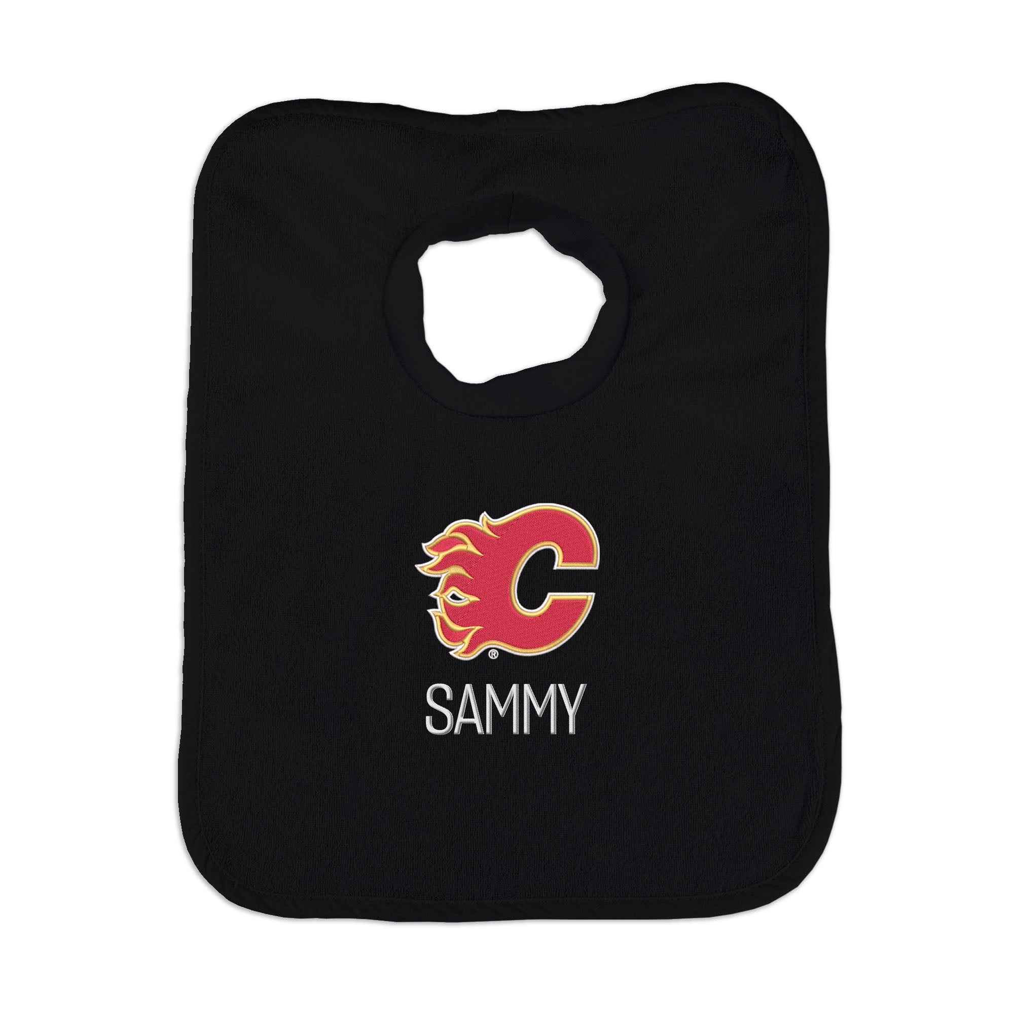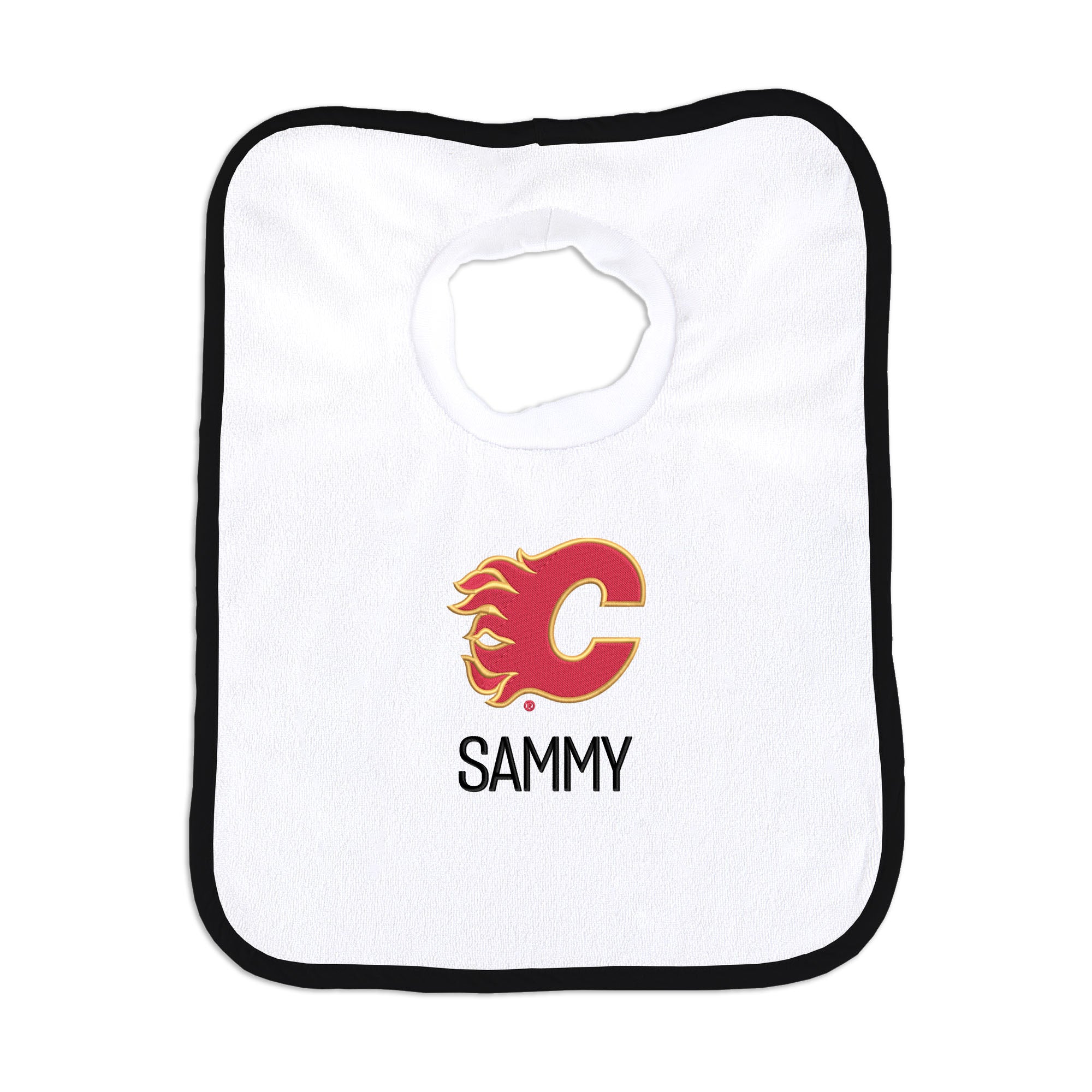 Our Personalized Calgary Flames Bib is the perfect accessory for every baby lames fan. The bib slips on easily over baby’s head, with a neck hole that is specially designed for extra comfort with super soft, gently gathered stretch cotton. Each bib is embroidered with the Flames logo and your little one’s name or nickname. Makes a wonderful gift for new hockey babies and their families.