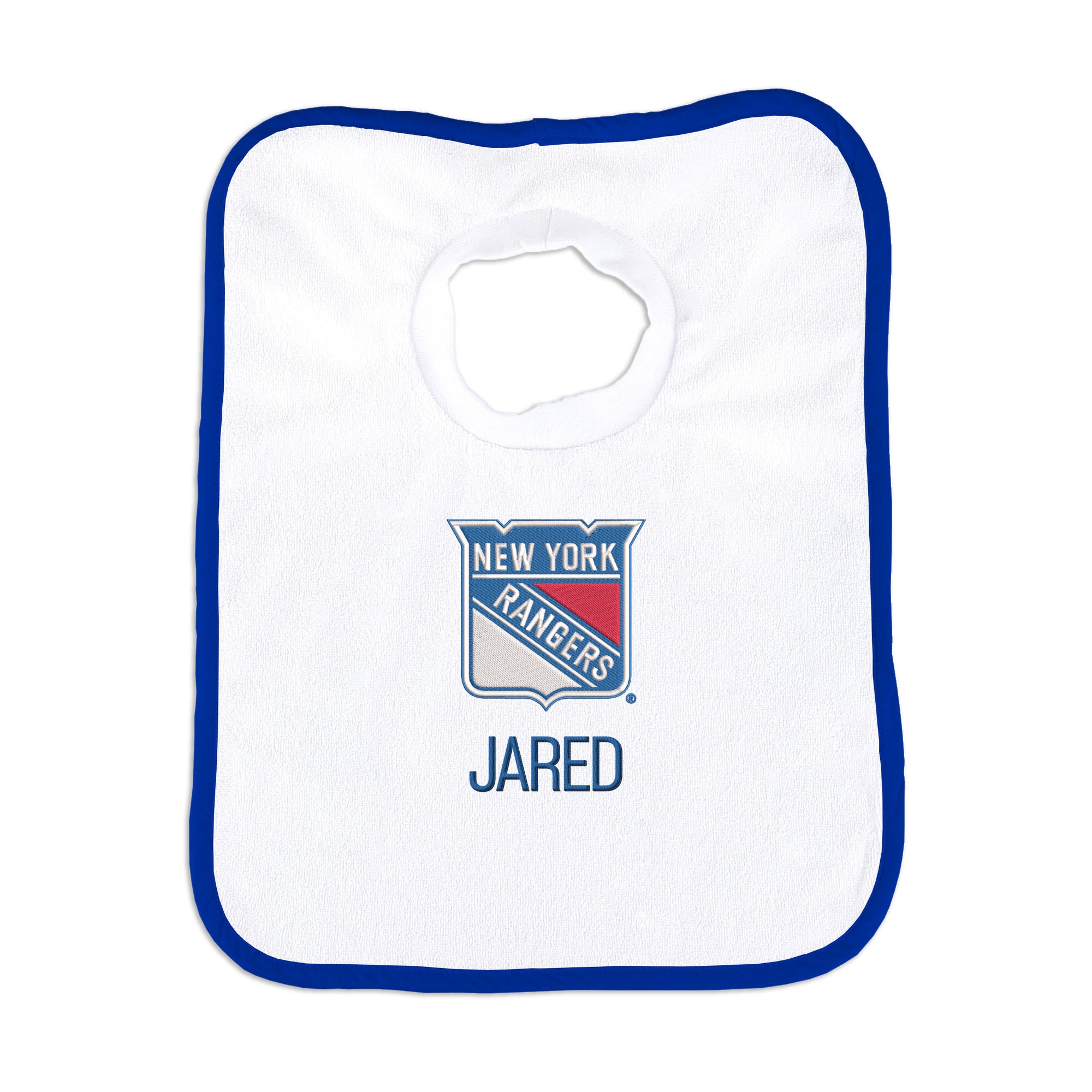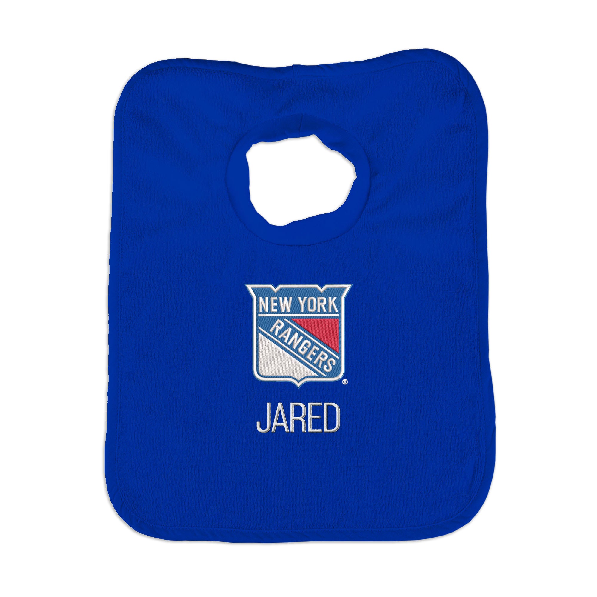Our Personalized New York Rangers Bib is the perfect accessory for every baby Rangers fan. The bib slips on easily over baby’s head, with a neck hole that is specially designed for extra comfort with super soft, gently gathered stretch cotton. Each bib is embroidered with the Rangers logo and your little one’s name or nickname. Makes a wonderful gift for new hockey babies and their families.