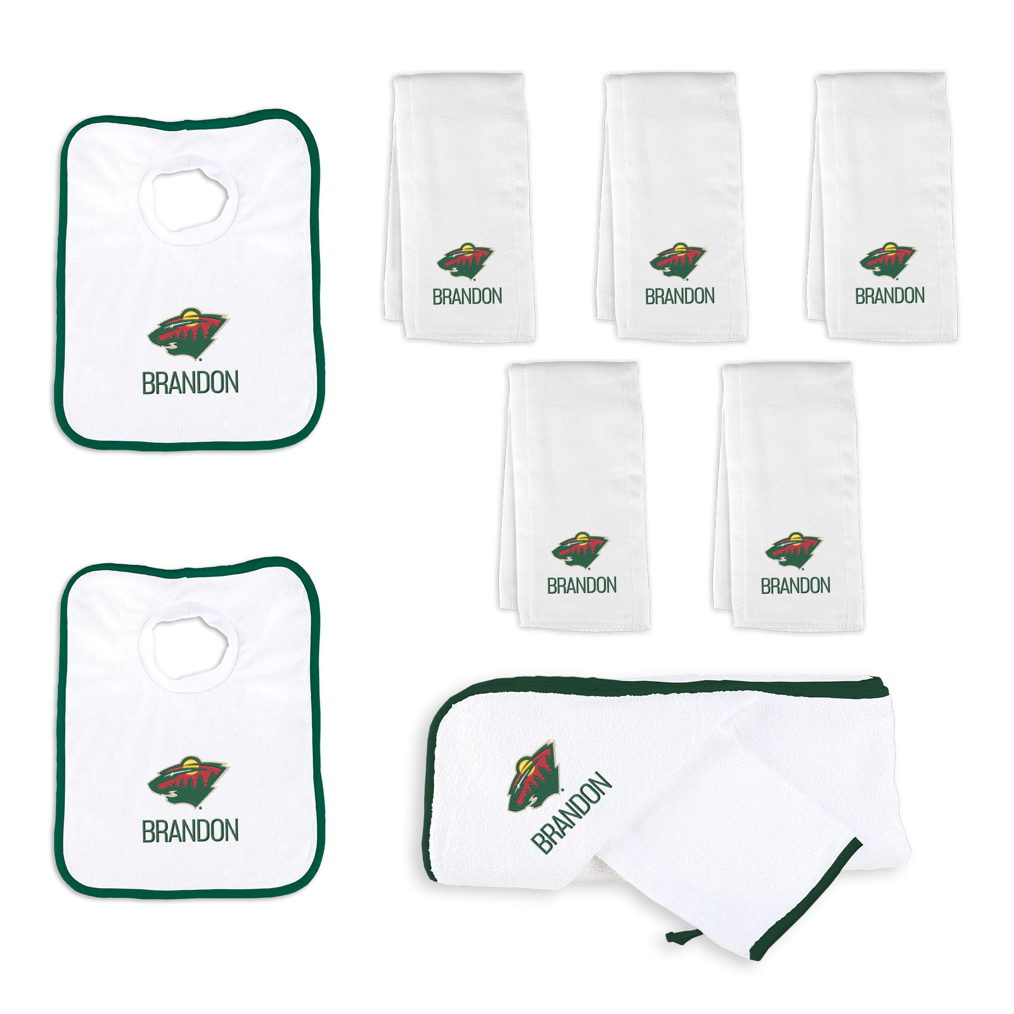 Our Personalized Minnesota Wild Large Gift Basket contains an assortment of our best-selling items packaged in a white willow basket with a personalized cotton liner. Each basket holds five of our 100% cotton burp cloths, two 100% cotton terry pullover bibs, and one 100% cotton terry hooded towel and wash mitt. The burp cloths, bibs and hooded towel are each embroidered with the Wild logo and baby’s name or nickname; the basket liner is embroidered with the baby’s name.