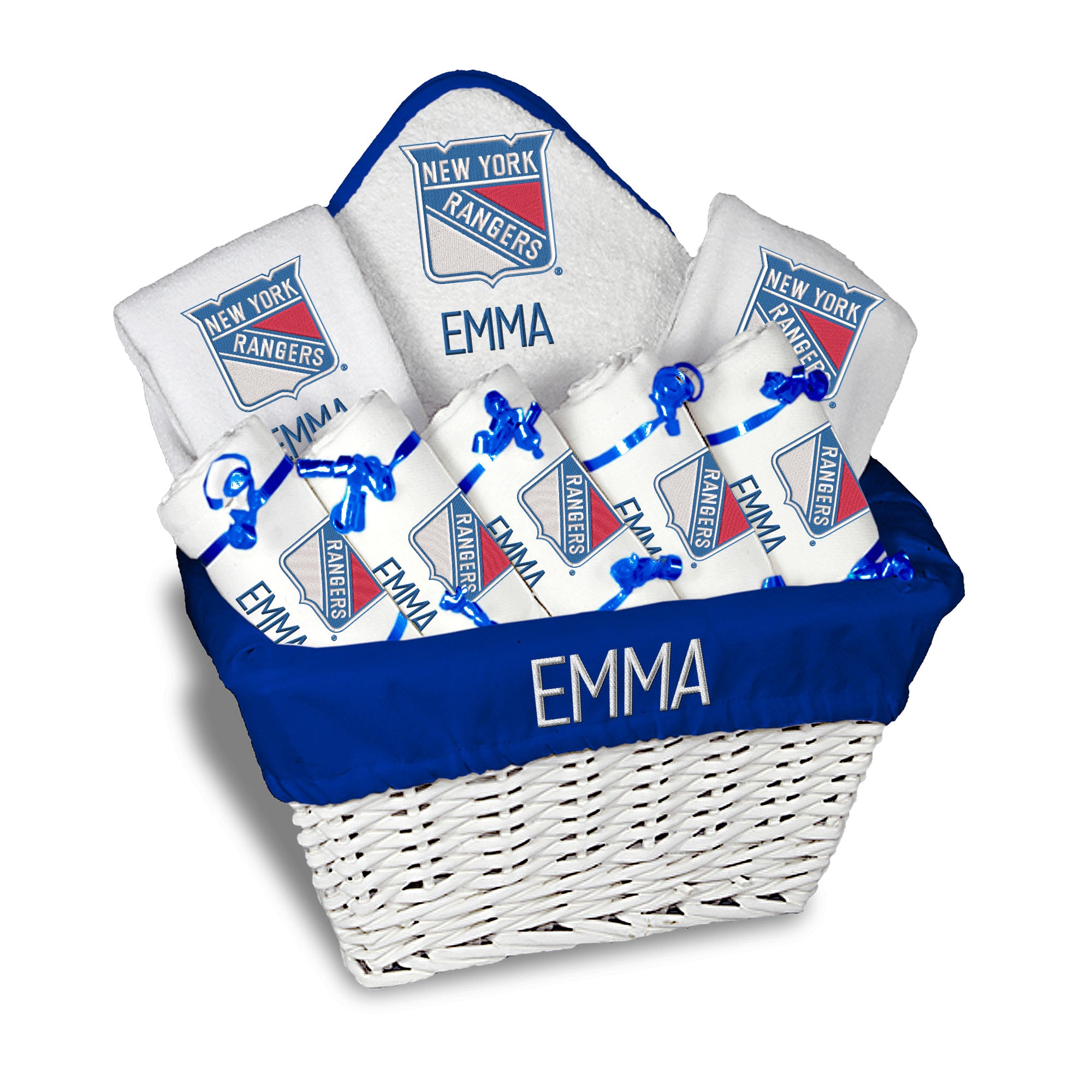 Our Personalized New York Rangers Large Gift Basket contains an assortment of our best-selling items packaged in a white willow basket with a personalized cotton liner. Each basket holds five of our 100% cotton burp cloths, two 100% cotton terry pullover bibs, and one 100% cotton terry hooded towel and wash mitt. The burp cloths, bibs and hooded towel are each embroidered with the Rangers logo and baby’s name or nickname; the basket liner is embroidered with the baby’s name.
