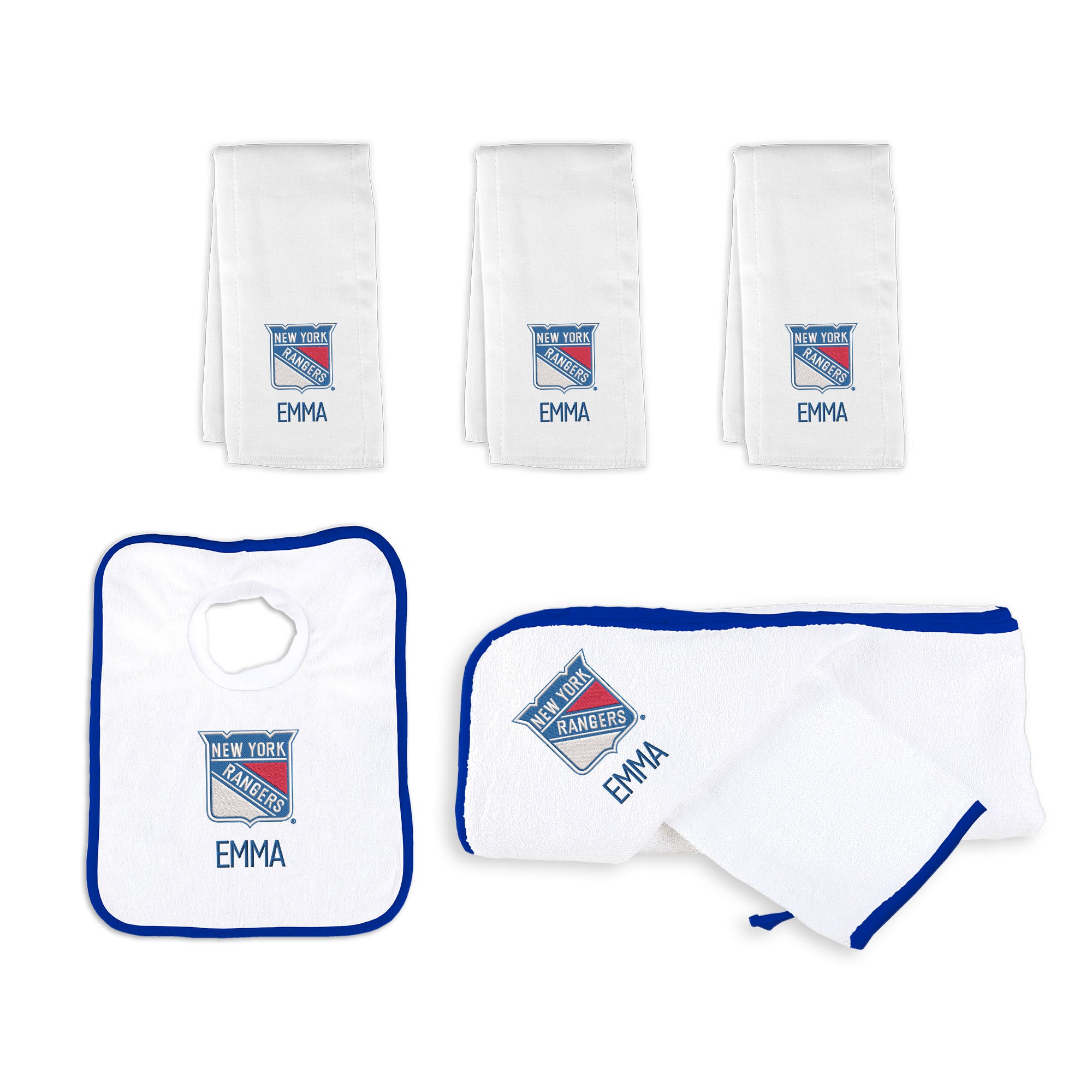 This personalized gift basket contains a trio of 100% cotton burp cloths, a 100% cotton terry pullover bib, and a 100% cotton terry hooded towel with a wash mitt. Each of these high-quality items is expertly embroidered with the iconic New York Rangers logo, making them the ideal choice for young Rangers fans in the making.
