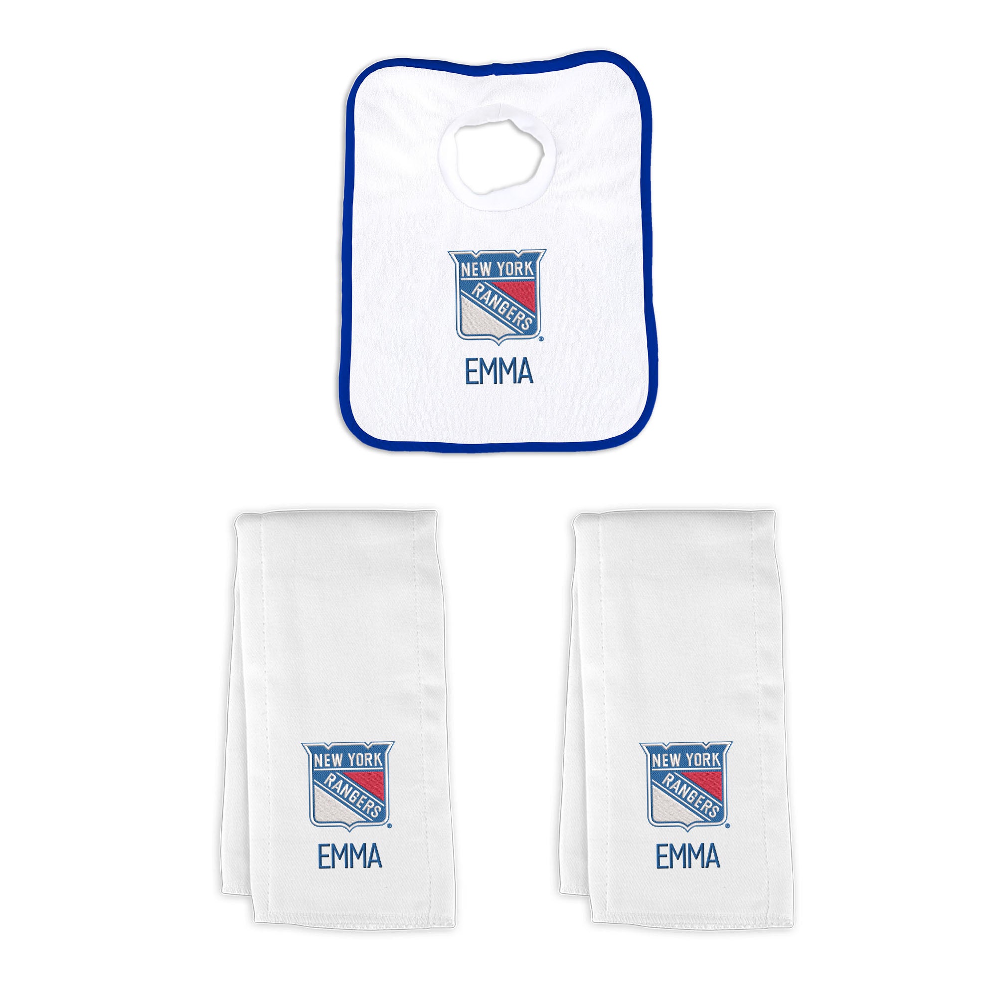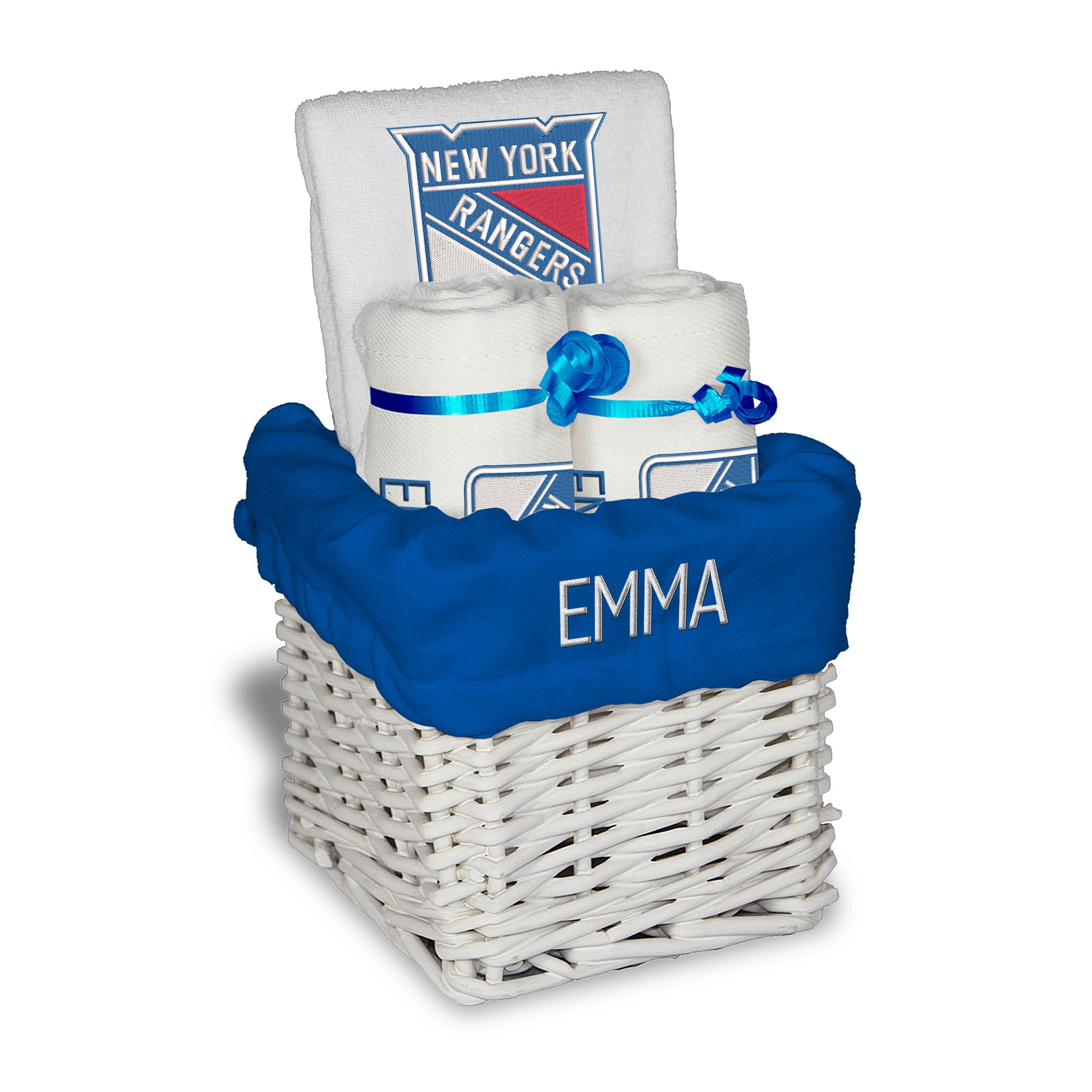 Our Personalized New York Rangers Small Gift Basket contains 3 of our best-selling items packaged in a white willow basket with a personalized cotton liner. Each basket holds 2 of our 100% cotton burp cloths and a 100% cotton terry pullover bib. each piece is embroidered with the official Rangers logo and baby's name or nickname.