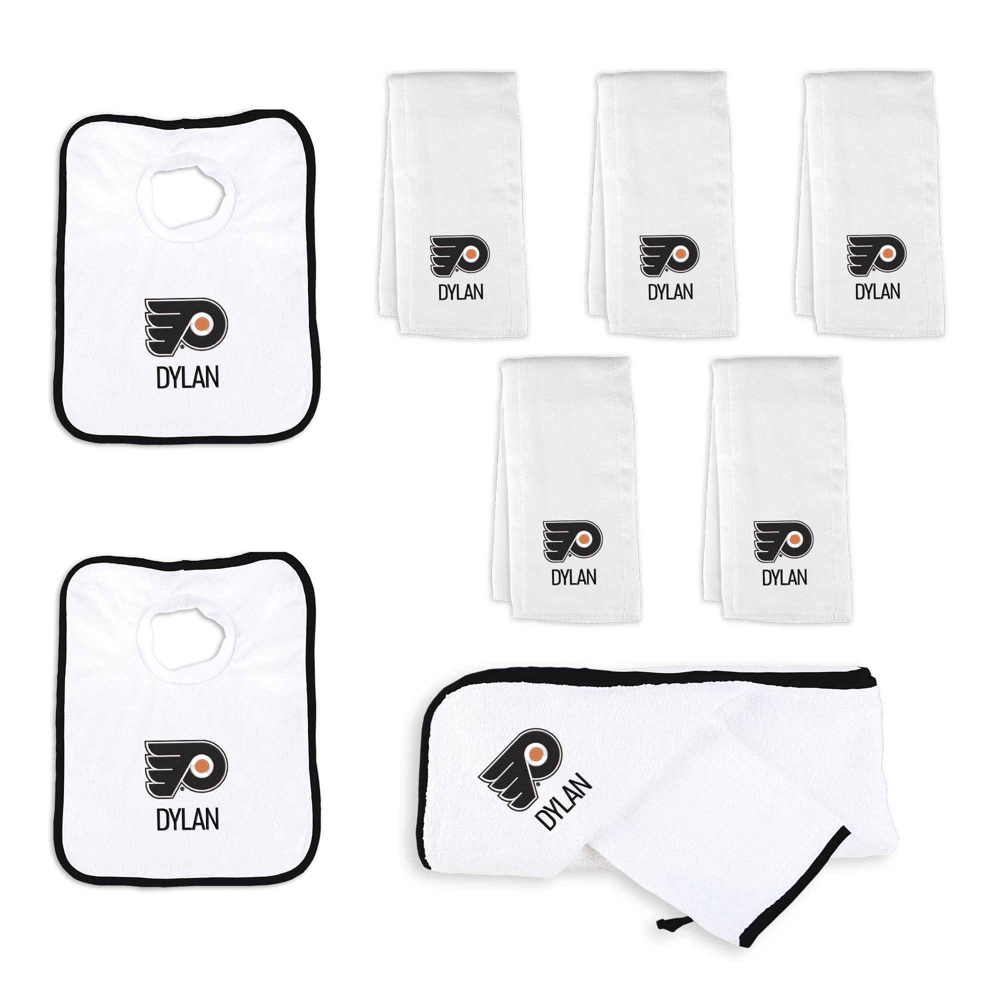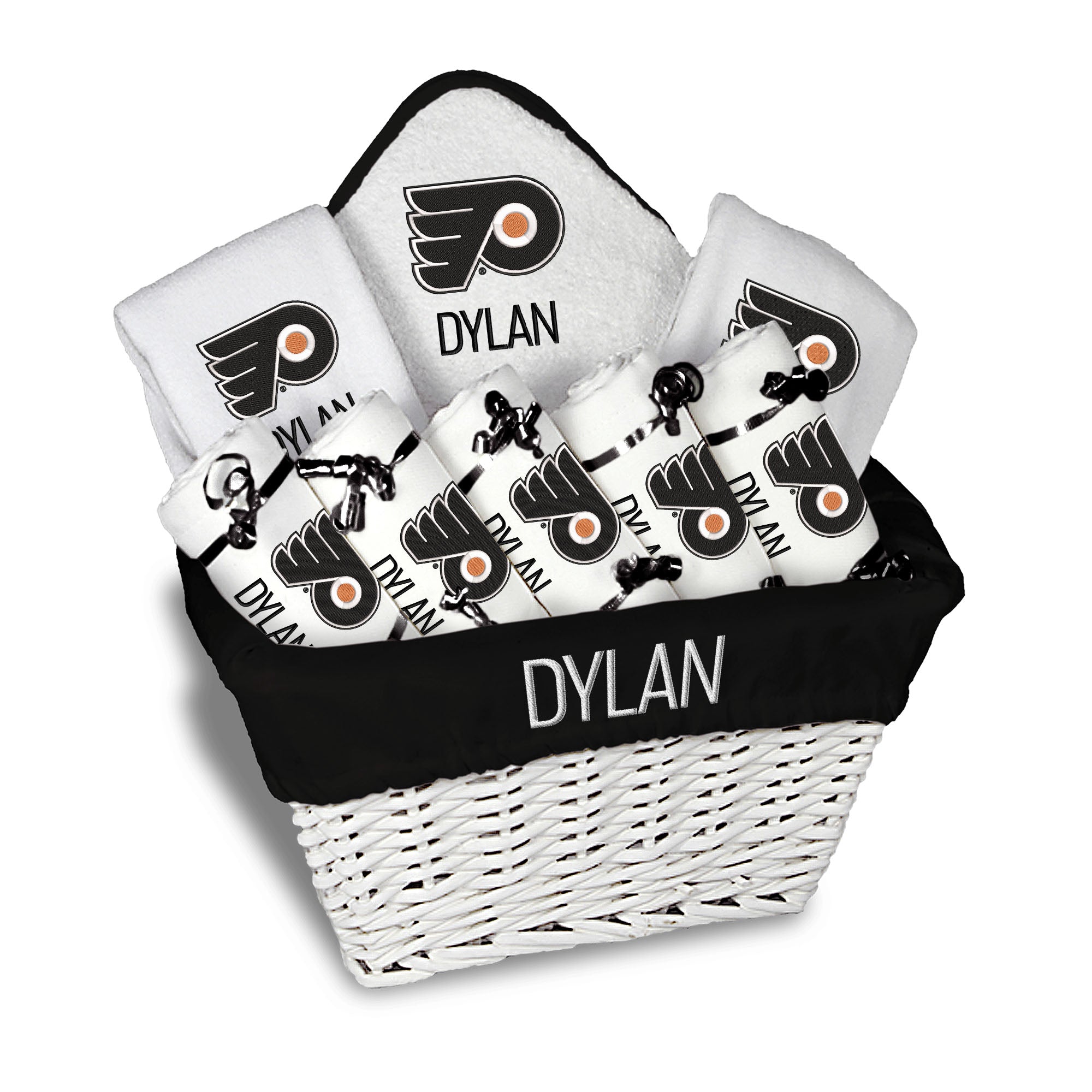 Our Personalized Philadelphia Flyers Large Gift Basket contains an assortment of our best-selling items packaged in a white willow basket with a personalized cotton liner. Each basket holds five of our 100% cotton burp cloths, two 100% cotton terry pullover bibs, and one 100% cotton terry hooded towel and wash mitt. The burp cloths, bibs and hooded towel are each embroidered with the Flyers logo and baby’s name or nickname; the basket liner is embroidered with the baby’s name.